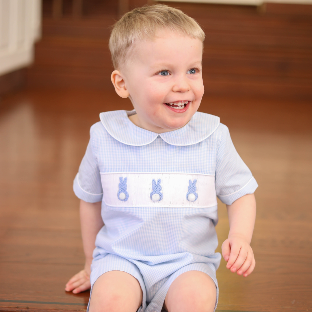 Blue Gingham Smocked Easter Bunny Shortall