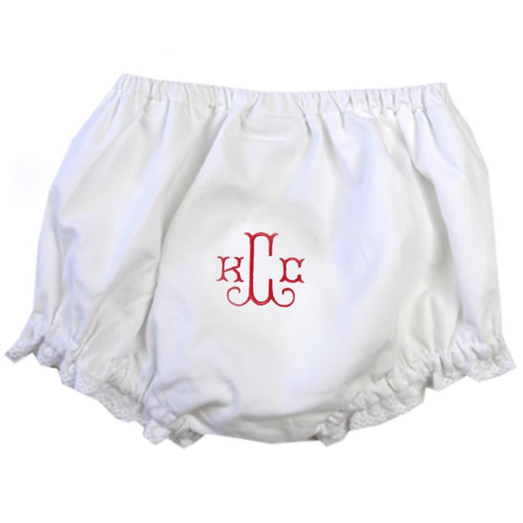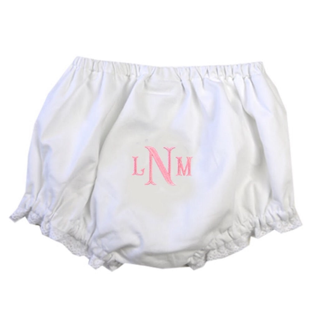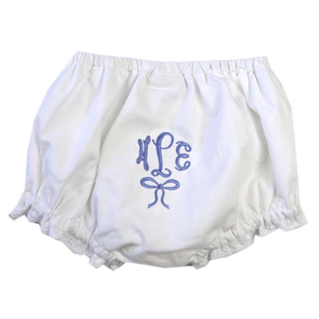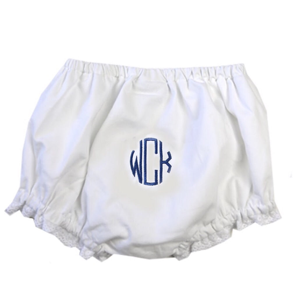 These cotton bloomers are just too sweet and perfect for a little lady. Classic soft white cotton is trimmed in a delicate lace at the leg opening. Choose a monogram style and thread color to create the perfect gift! They make the most precious baby gifts too!