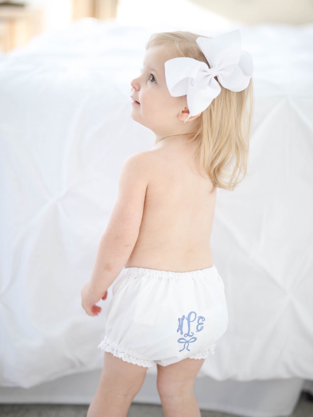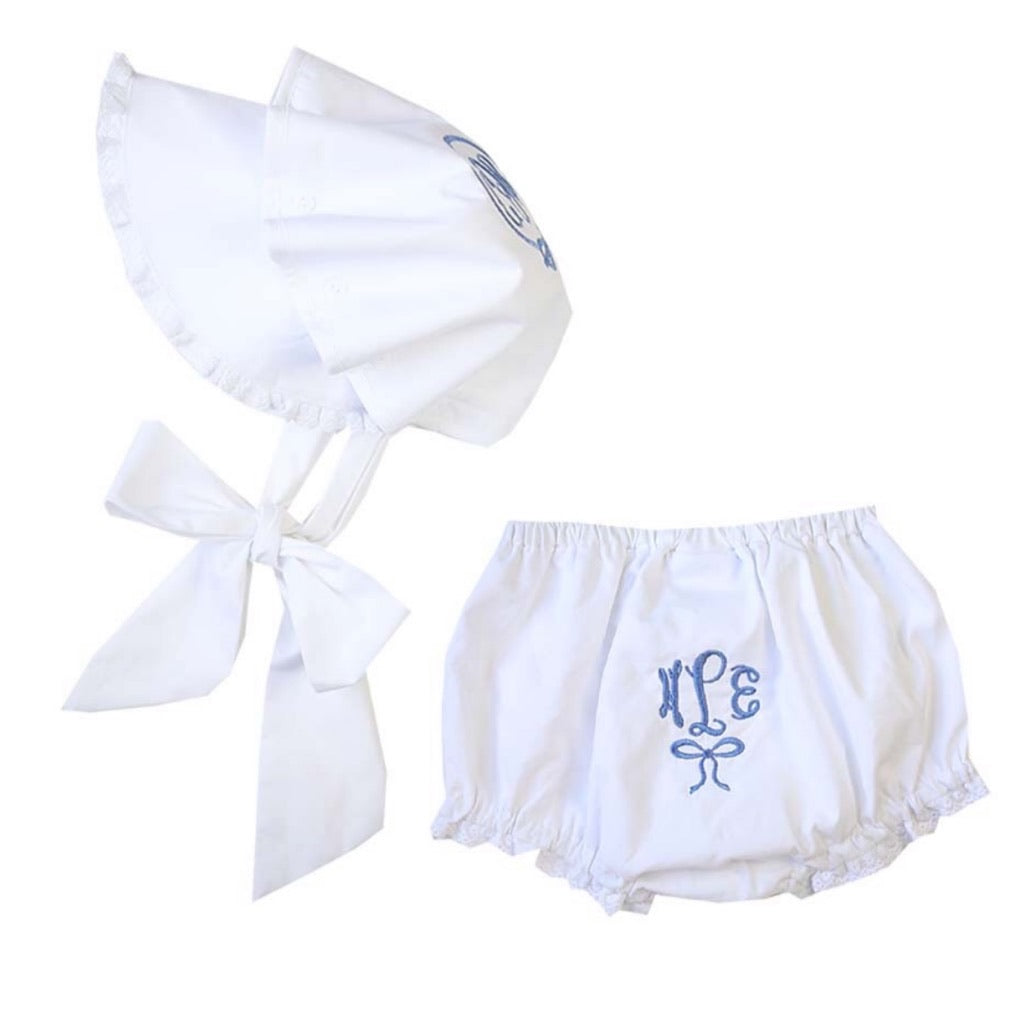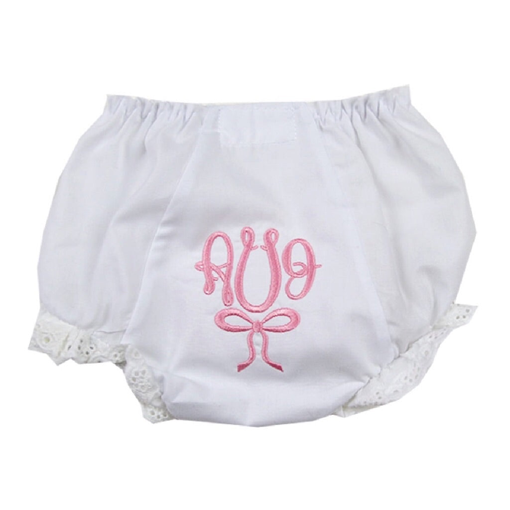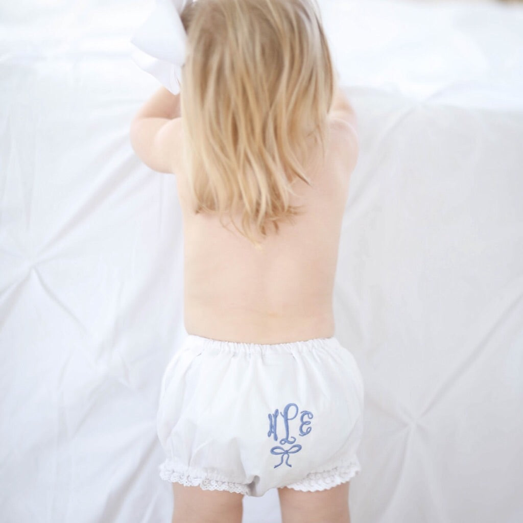 These cotton bloomers are just too sweet and perfect for a little lady. Classic soft white cotton is trimmed in a delicate lace at the leg opening. Choose a monogram style and thread color to create the perfect gift! They make the most precious baby gifts too!