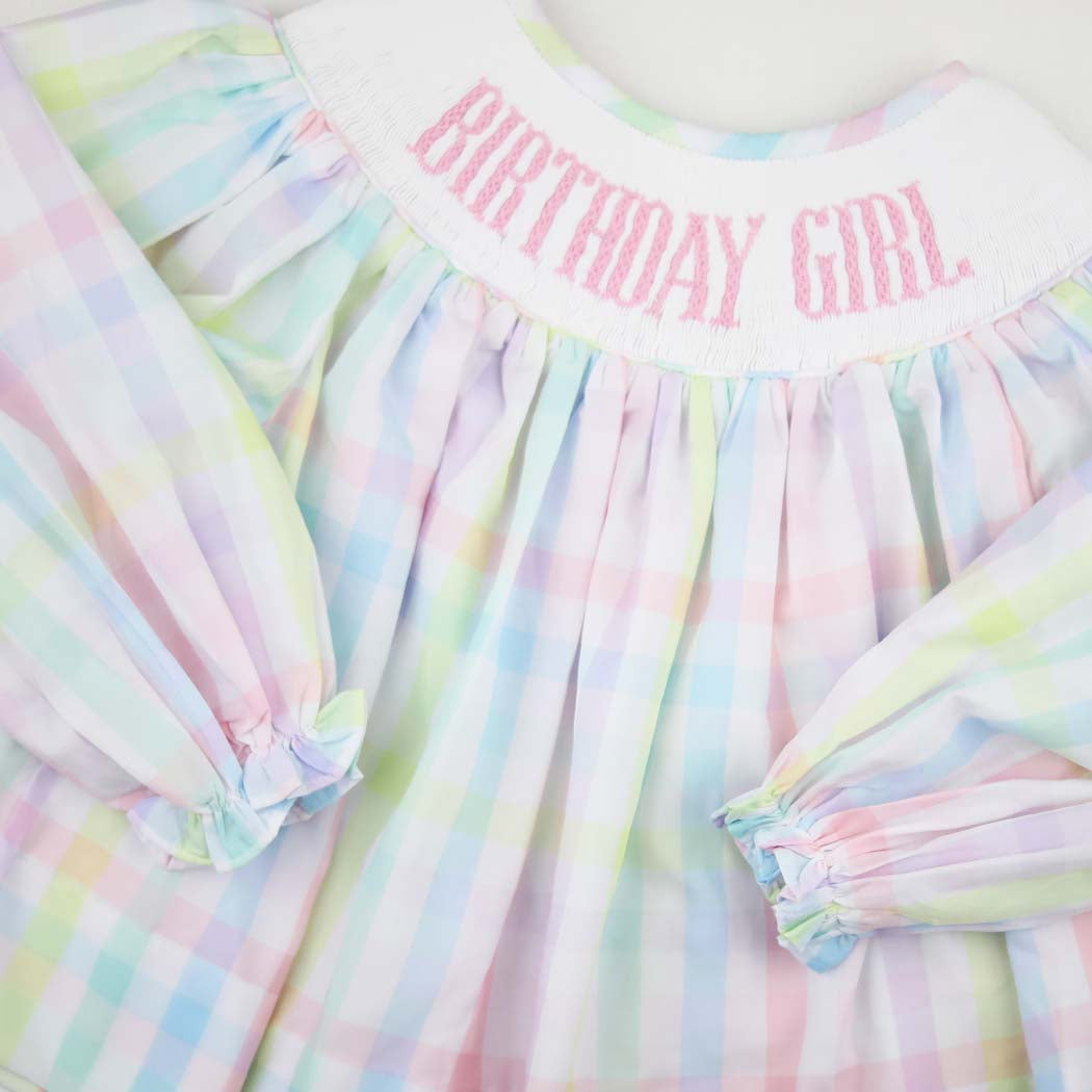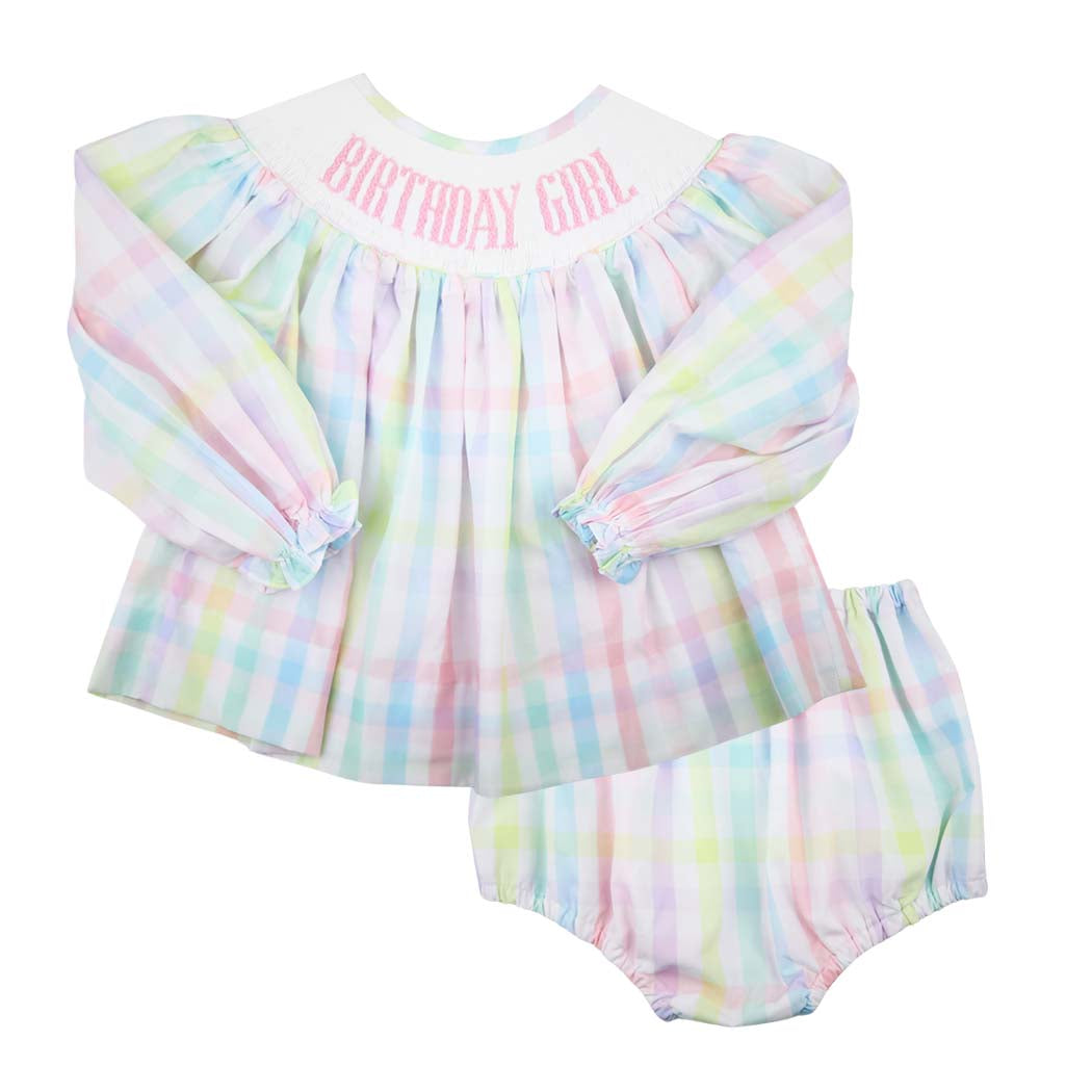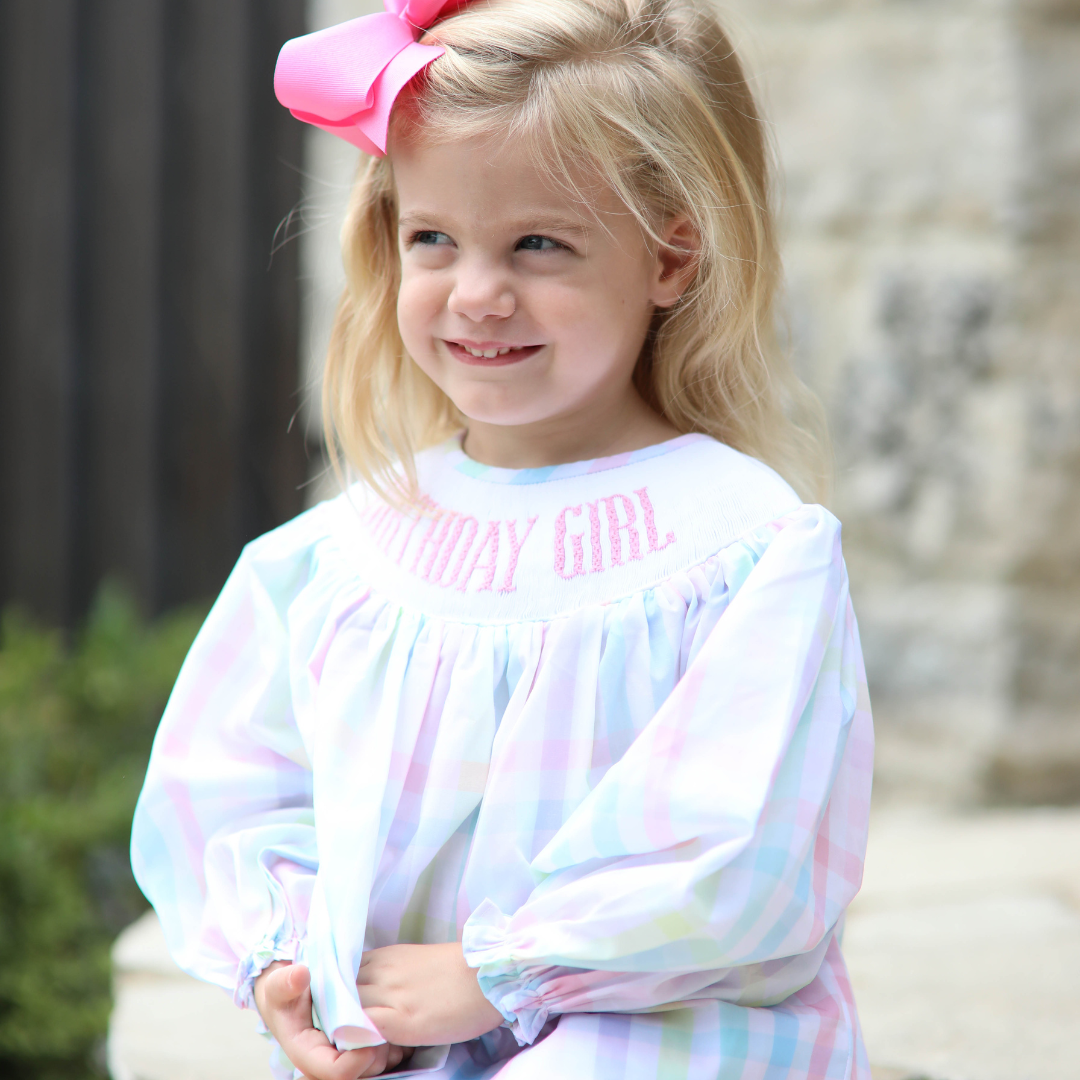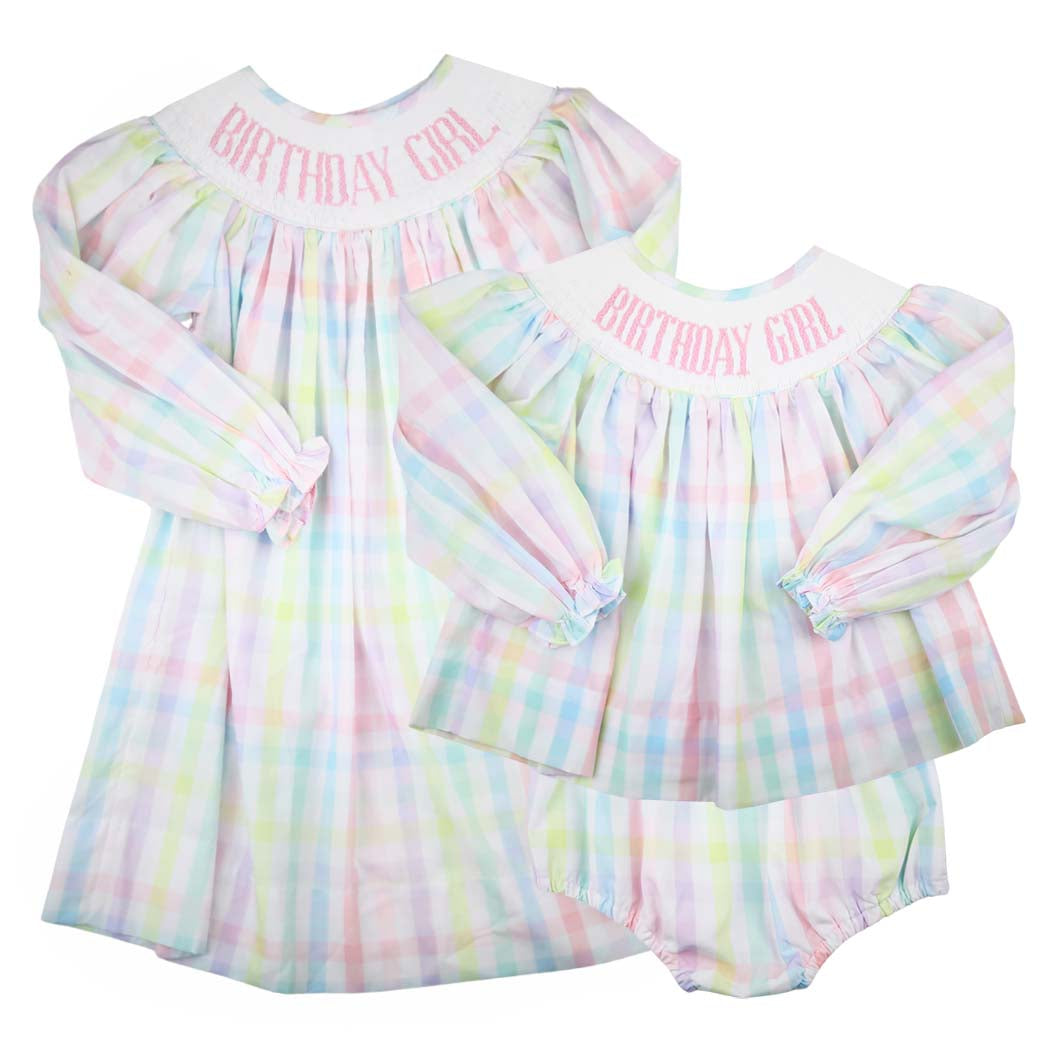 Get ready to blow out those birthday candles with the sweetest birthday collection! This precious set features smocked “birthday girl” along the collar and is made from beautiful rainbow windowpane fabric. The set comes with a matching pair of bloomer covers. Be sure to get your cameras ready!
