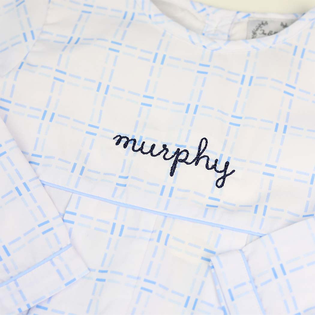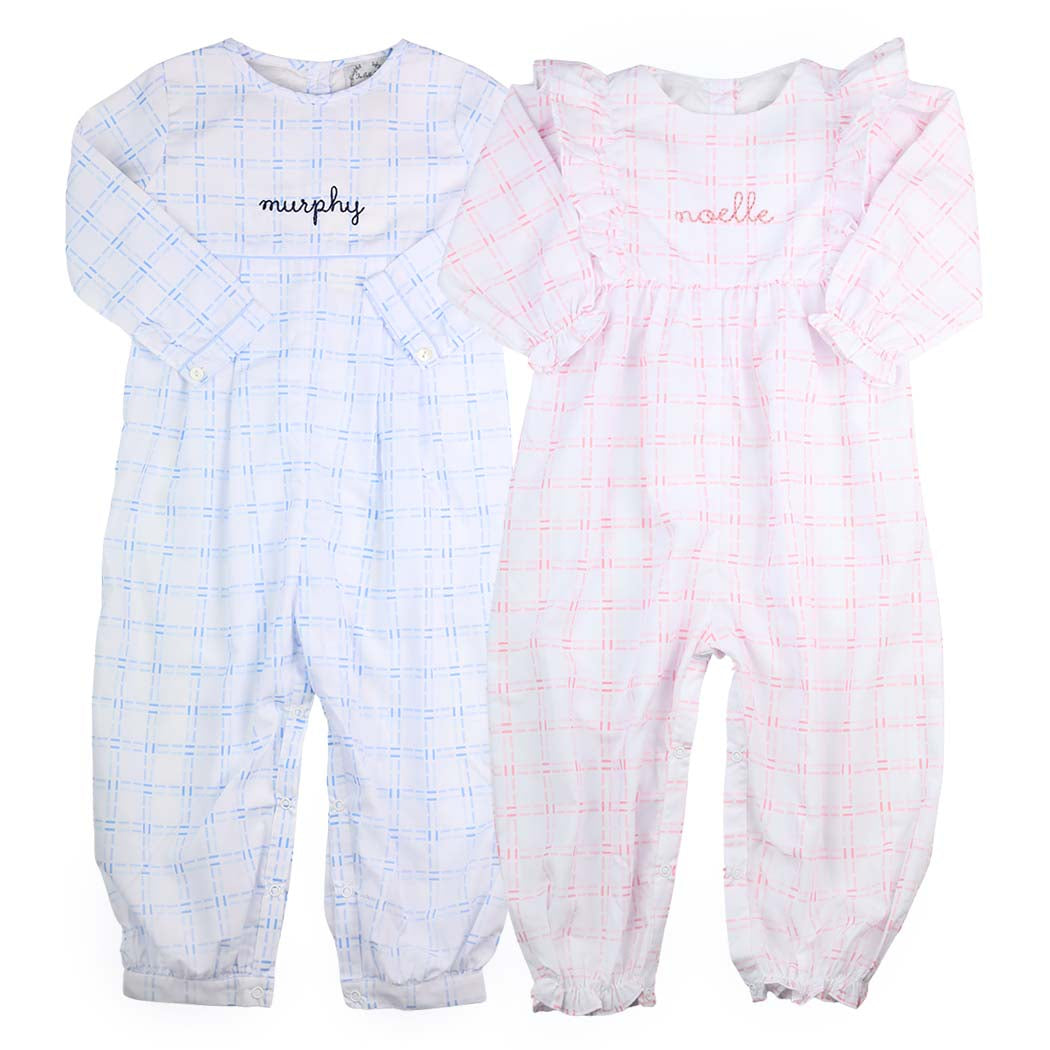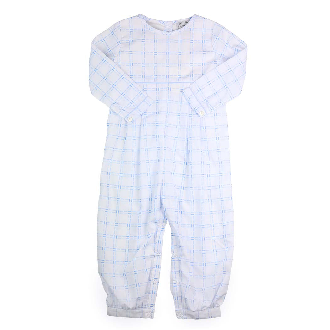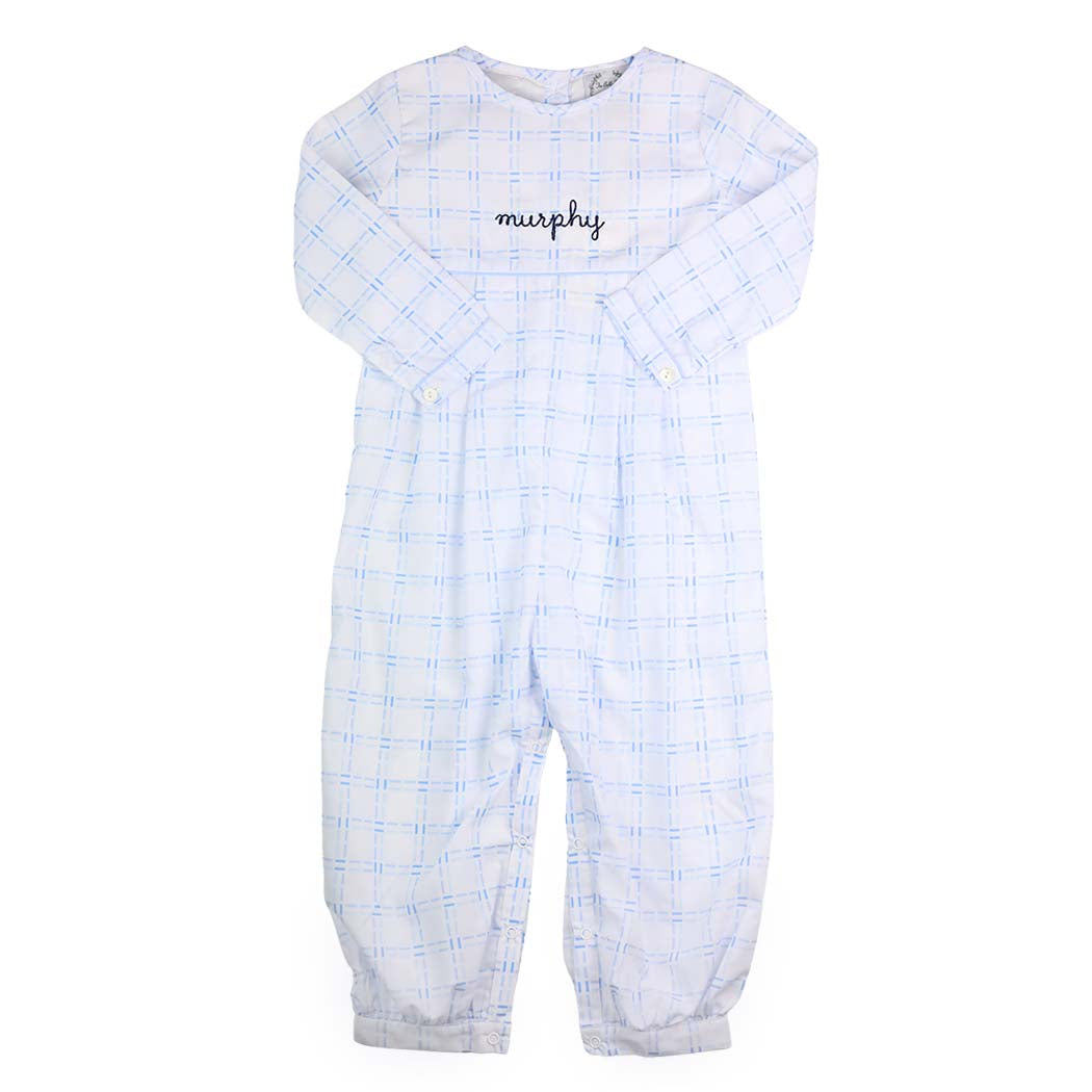This adorable romper for baby boys is made from a soft woven cotton blend. Baby blue piping lines the sleeves, ankles and chest. Add a monogram or name to make it extra sweet. Looking for a gift for a new baby? This is a favorite of many new and expecting moms!
