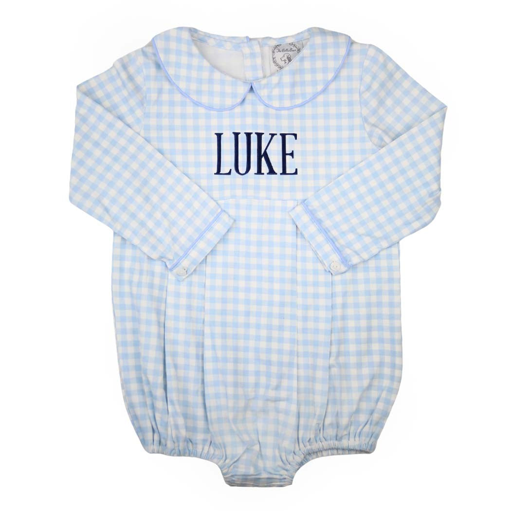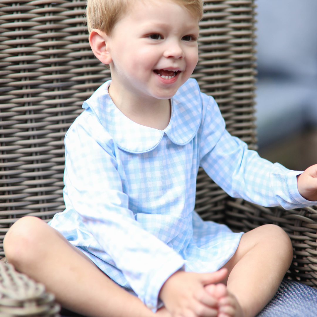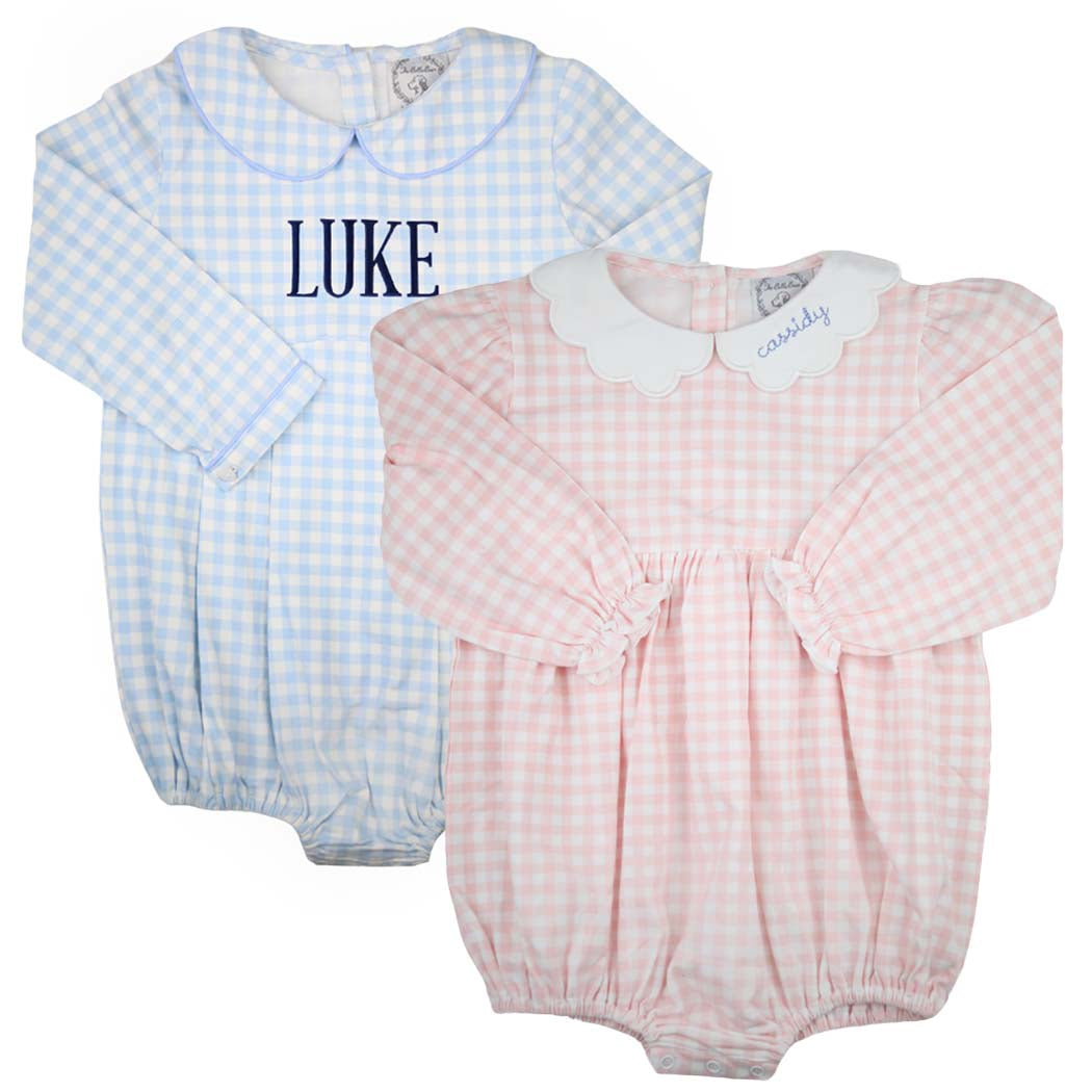 Our best-selling knit bubbles are now available with long sleeves! Featuring a scalloped Peter Pan collar, this blue gingham bubble will look even more precious with personalization on the chest. There are snaps at the stride for easy changing.