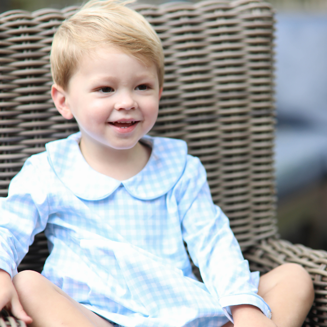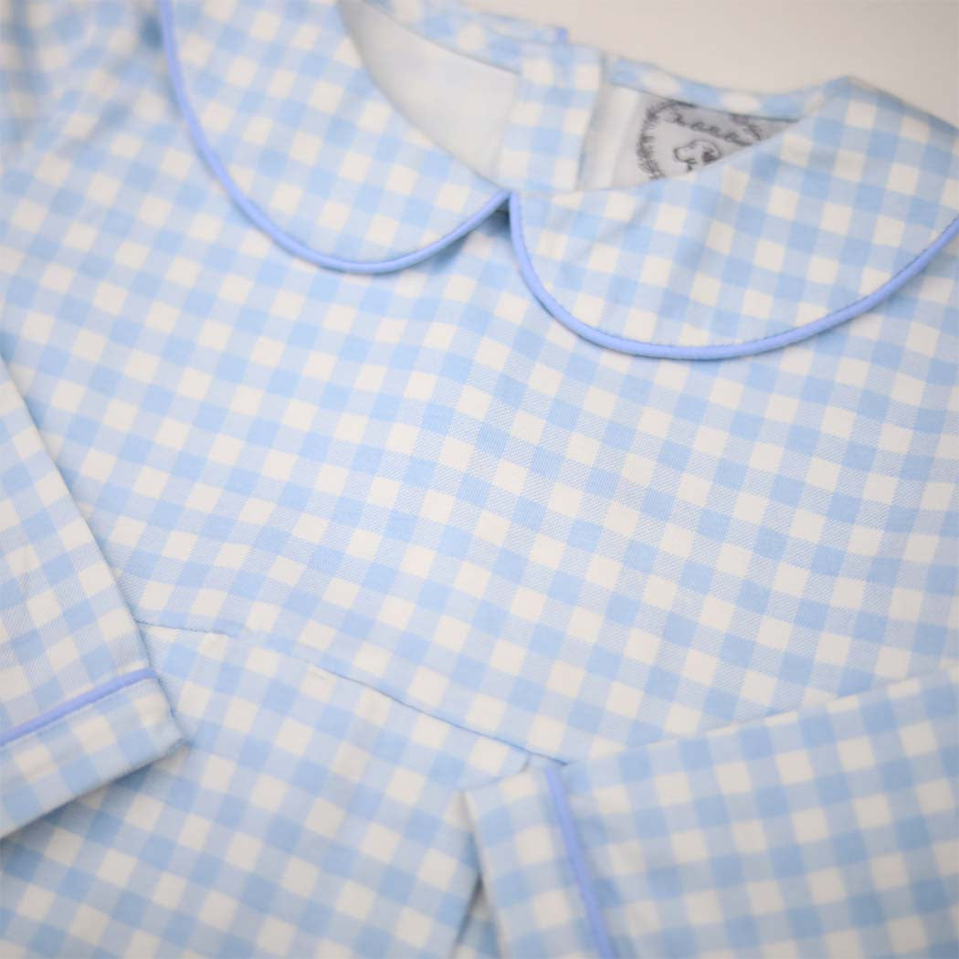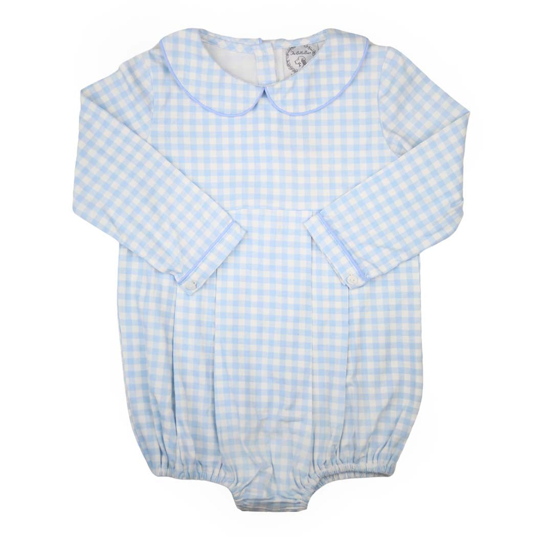 Our best-selling knit bubbles are now available with long sleeves! Featuring a scalloped Peter Pan collar, this blue gingham bubble will look even more precious with personalization on the chest. There are snaps at the stride for easy changing.