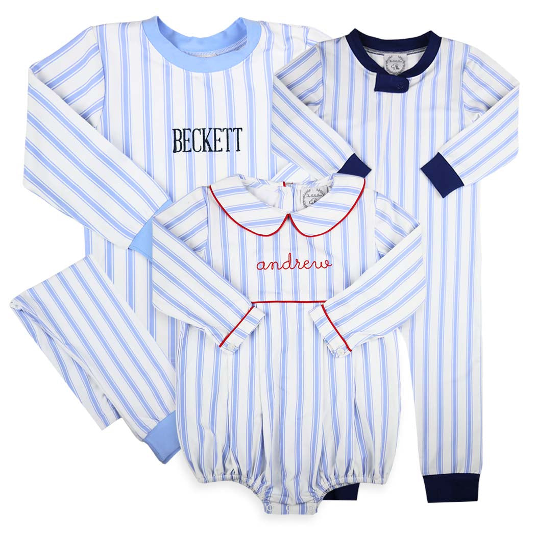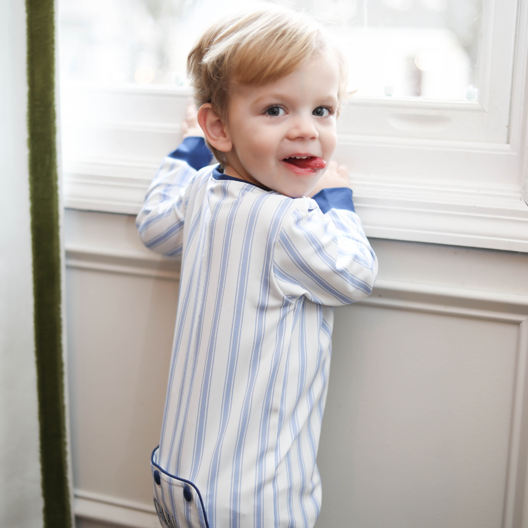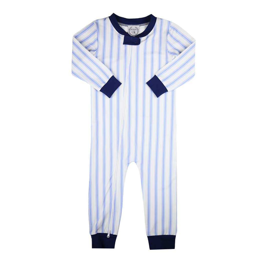 It’s hard to imagine anything more classic and precious! Our Blue Ticking Striped zippered set is a timeless choice for your little one! Featuring a classic ticking stripe pattern and a soft, breathable knit fabric, this romper is perfect for a major snuggle session! Navy piping trims the back flap and navy buttons secure it. Comfortable and stylish, it’s a wardrobe must-have. Shop now for a touch of classic perfection!