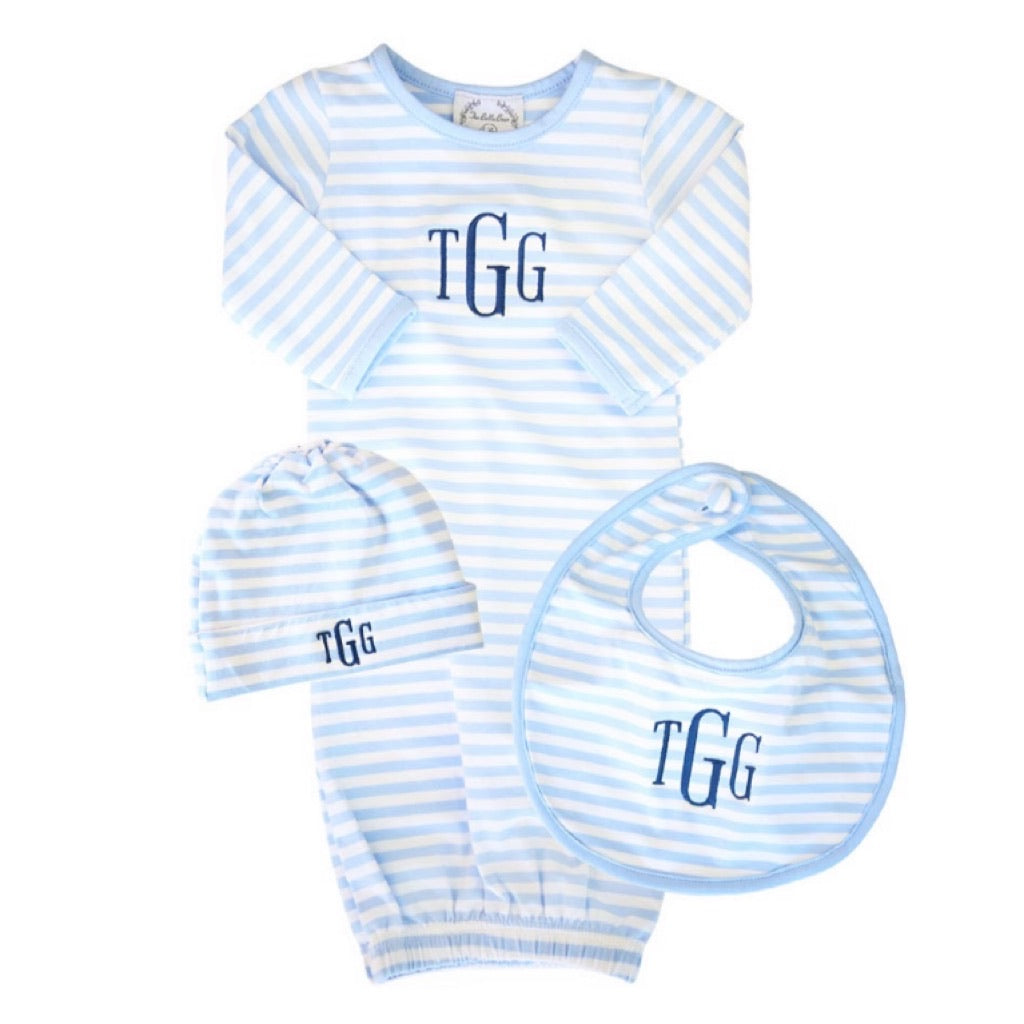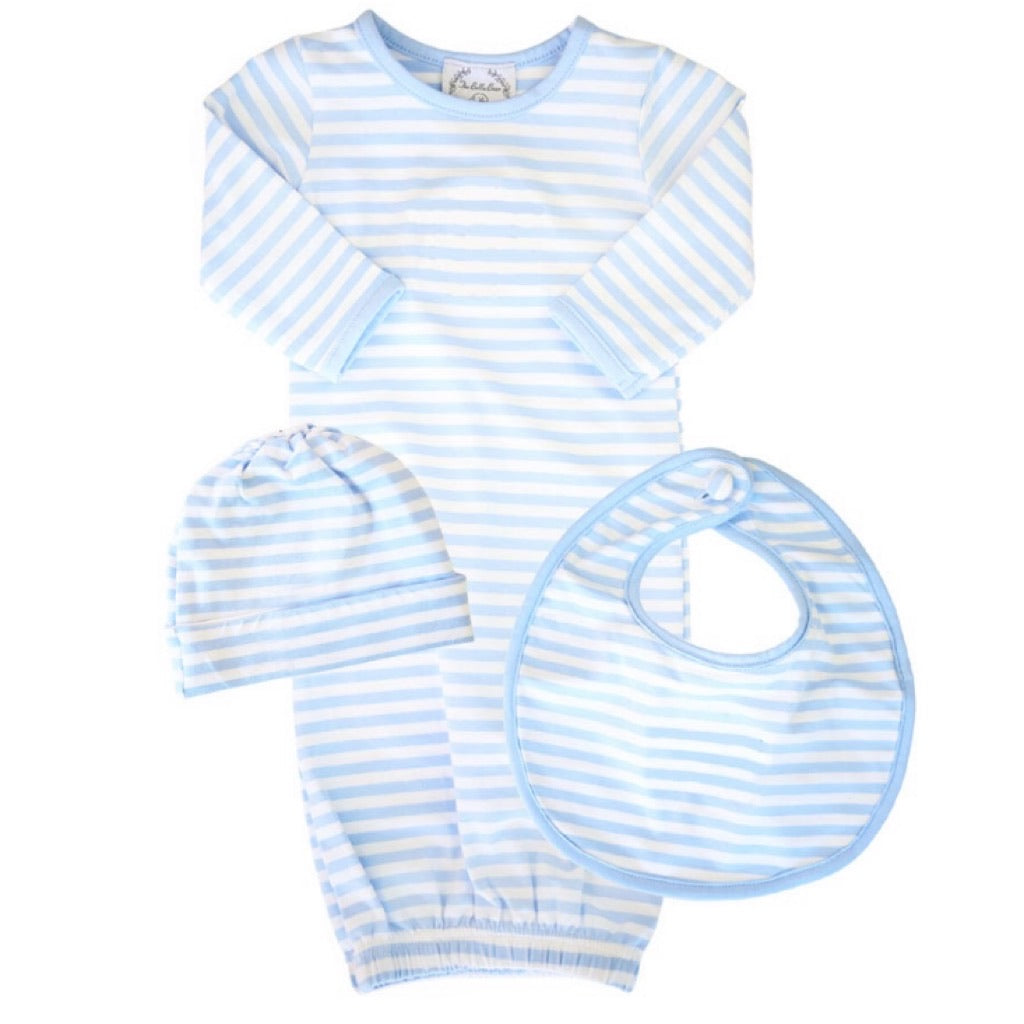 Cover them in pure sweetness with our brand new Baby Pink and Baby Blue Striped Gown sets. Each set includes a newborn sized footless gown (with elastic at the hem), a coordinating cap, and a coordinating bib. Made from soft knit cotton, these sets will make the perfect “coming home” outfit or the sweetest gift for the expecting!