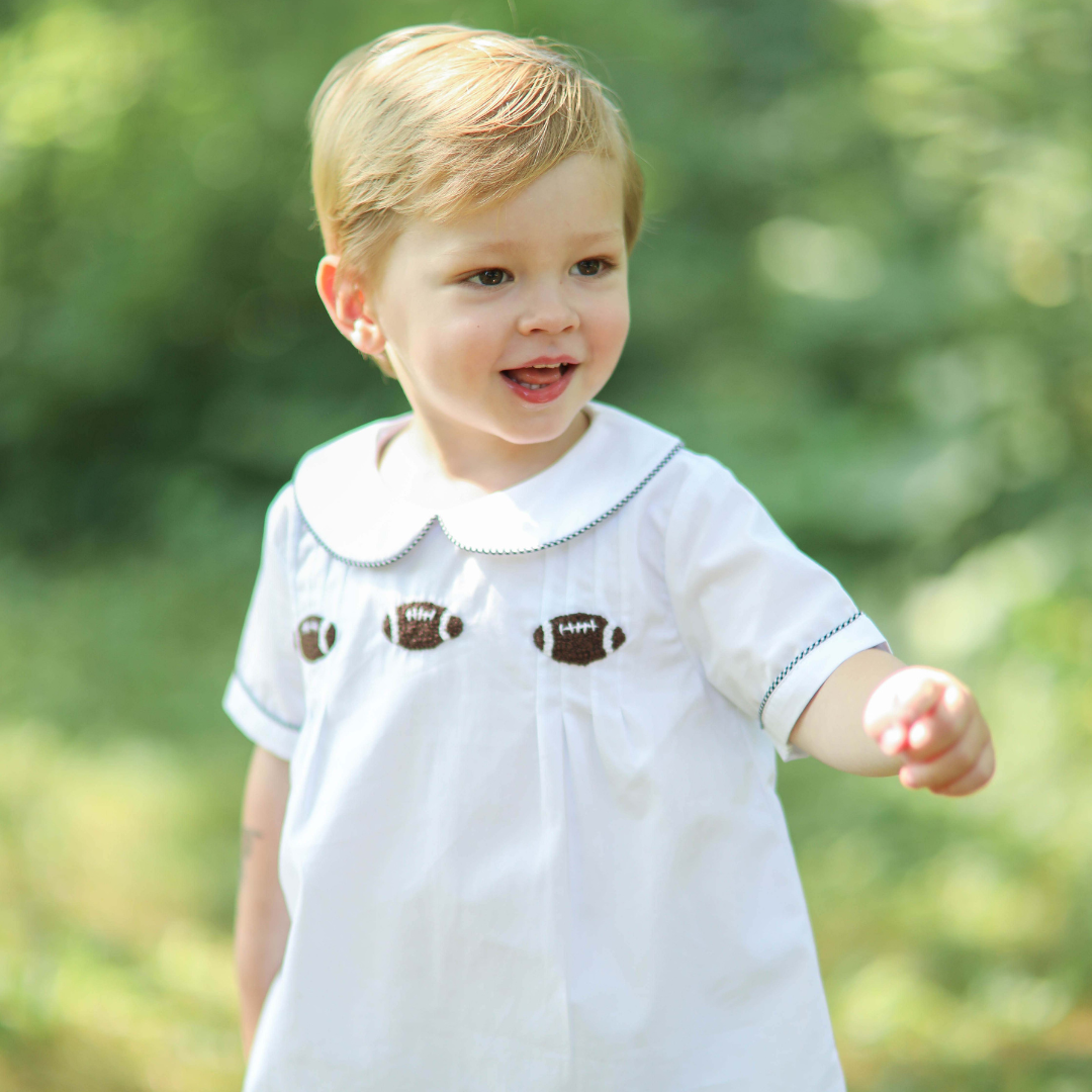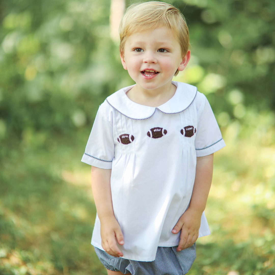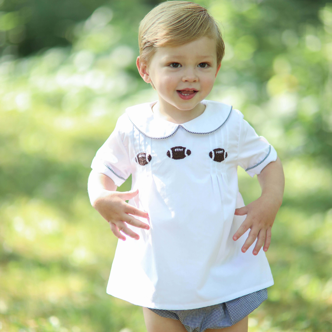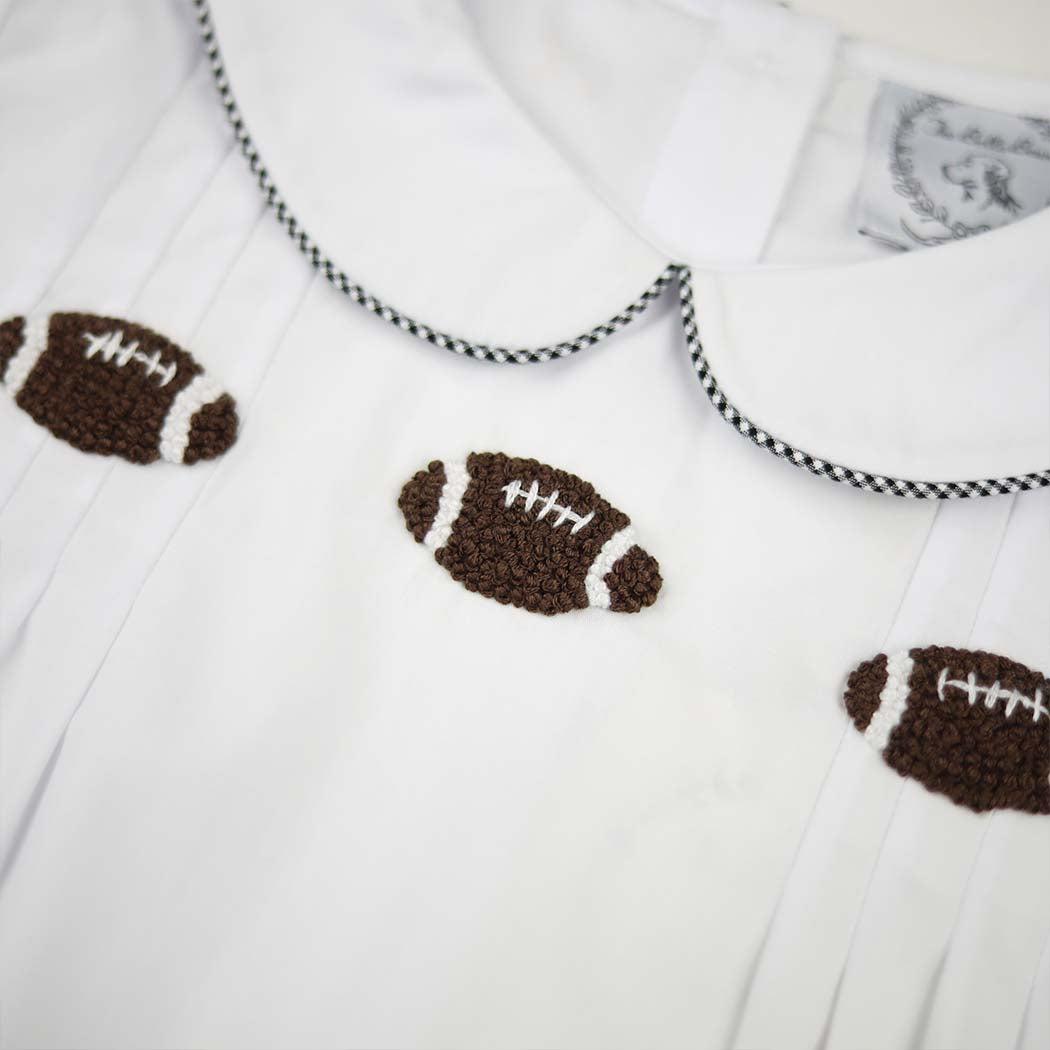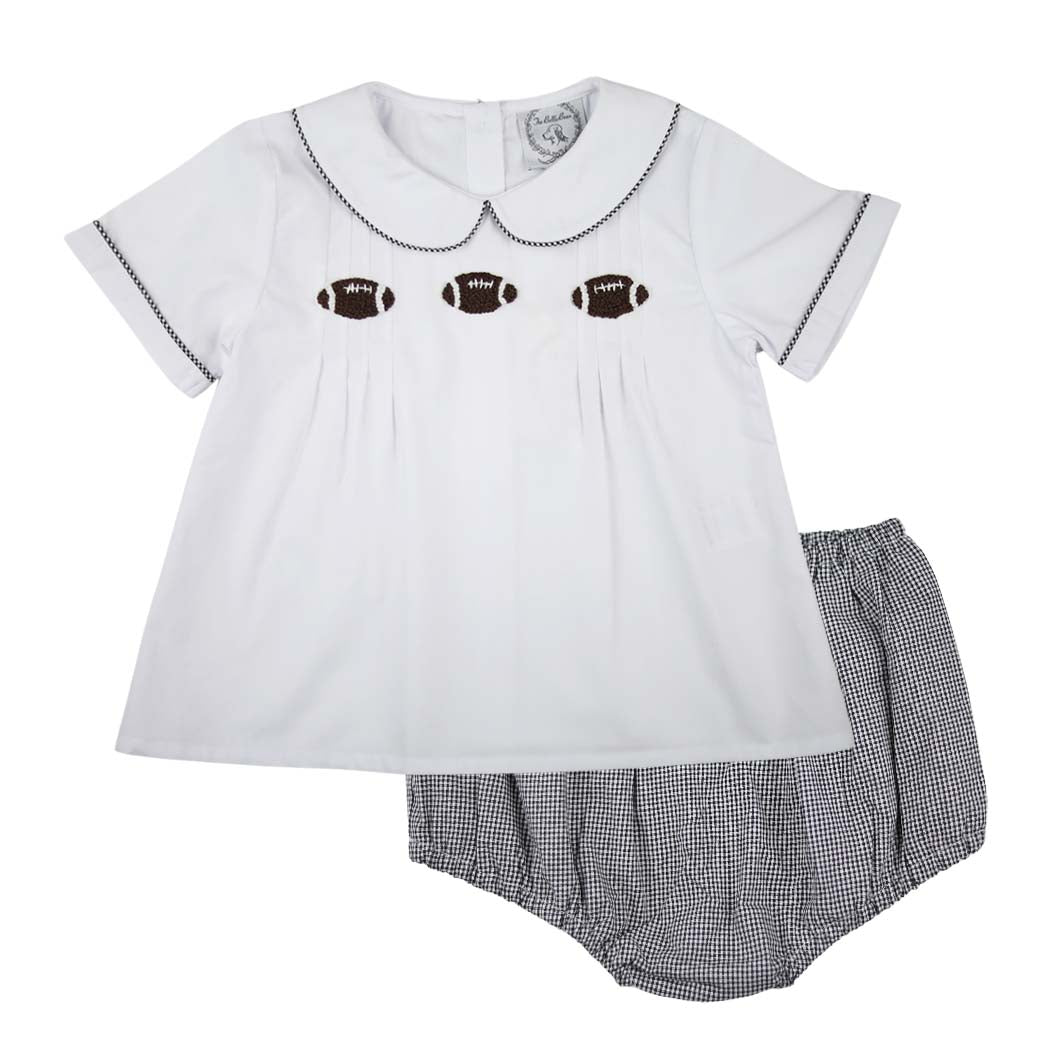 Bring on football season with the cutest football bloomer sets! This football-clad outfit features a hand French knotted footballs. The bloomer bottoms are made from mini black gingham fabric and there is coordinating trim on the top. This is a unisex set.