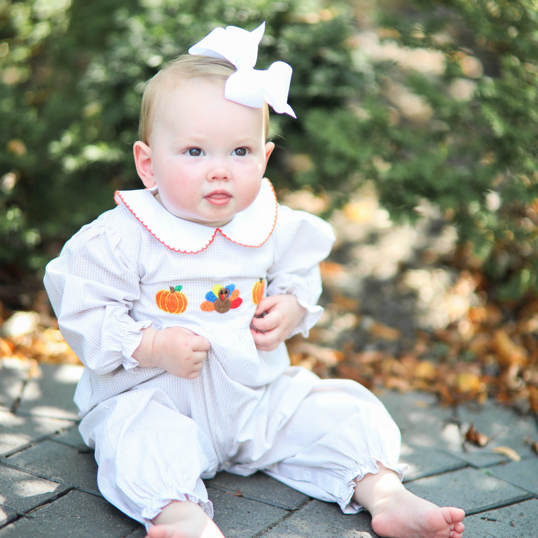 Sweet and seasonal, our Girls Thanksgiving Khaki Gingham Romper is perfect for fall festivities! Featuring a classic khaki gingham pattern with festive Thanksgiving details, this soft and comfy romper is ideal for family gatherings, holiday photos, and cozy autumn days. Finished with ruffle accents and easy snap closures for all-day wear and quick changes.