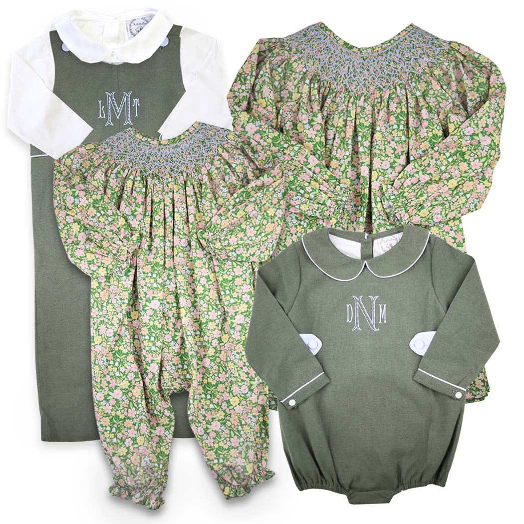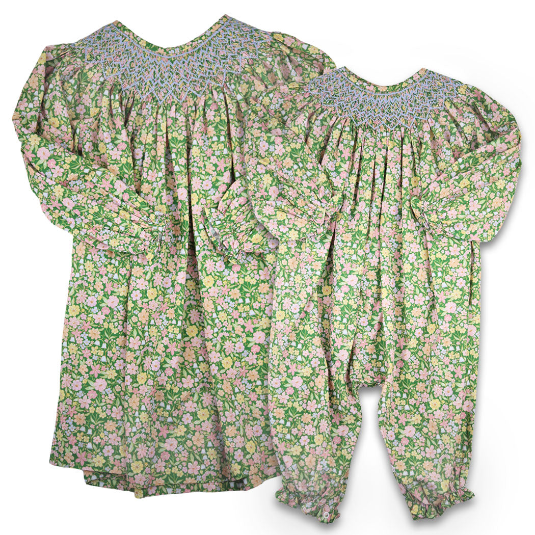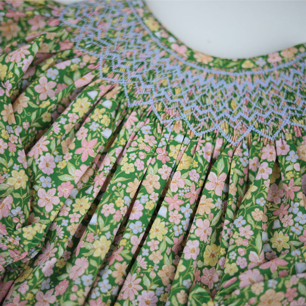 Made from soft woven cotton, this smocked olive green floral print features hues of green, light blue, pink and yellow. This dress has light blue smocking along the collar and the dress hits right around knee length.