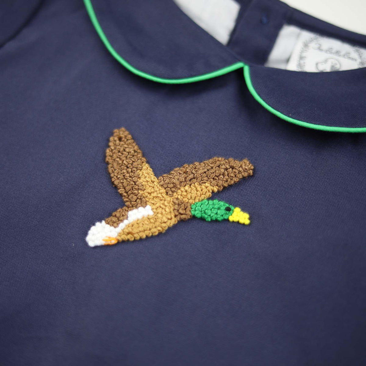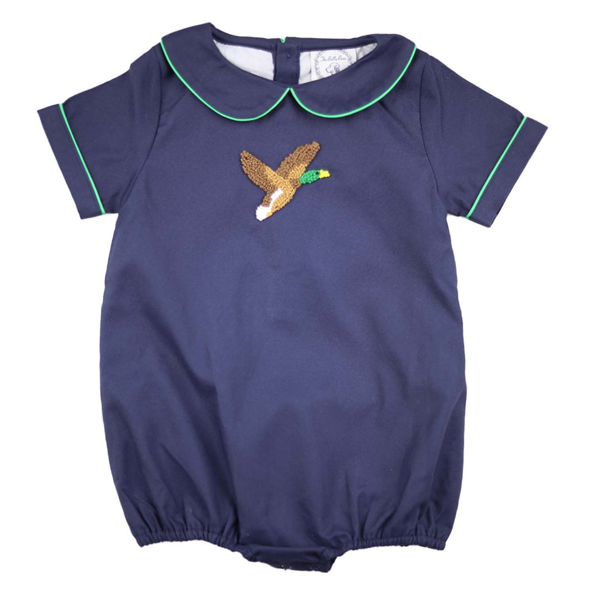 Dress your little one in timeless Southern style with our Navy Oxford Duck Bubble. This heirloom-quality bubble is crafted from soft, breathable cotton oxford in a rich navy blue, making it the perfect choice for fall and beyond. The outfit features an embroidered mallard duck detail across the chest, adding a charming, seasonal touch parents love for photos, holidays, and special outings.