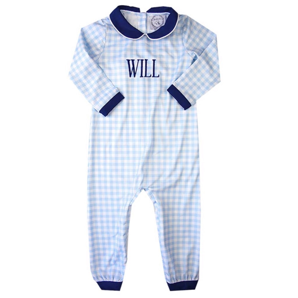 This adorable romper for baby boys is made from incredibly soft knit cotton. Navy knit fabric lines the sleeves, ankles and Peter Pan collar. Add a monogram or name to make it extra sweet. Looking for a gift for a new baby? This is a favorite of many new and expecting moms!