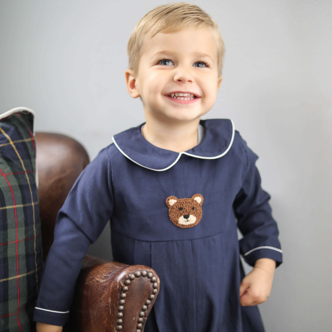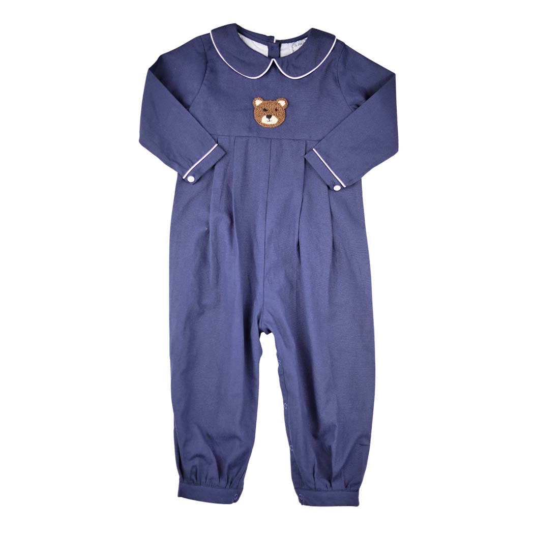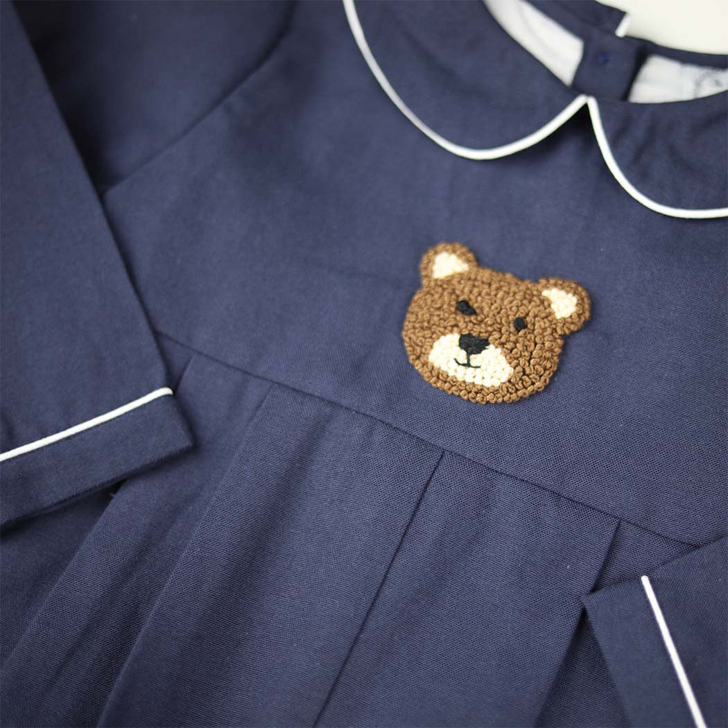 This darling romper is constructed of navy Oxford fabric—the perfect combo of bear and blue! Beautiful French Knotting is used to make the bear’s face. The collar and arm openings are trimmed in white piping and the legs feature snaps for easy changing.