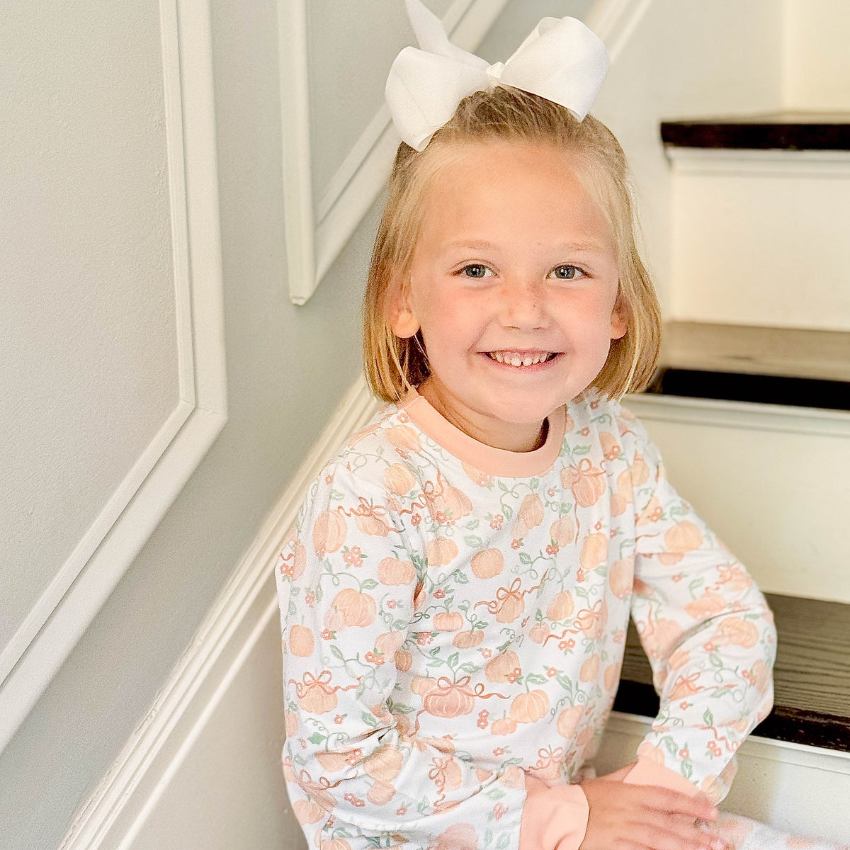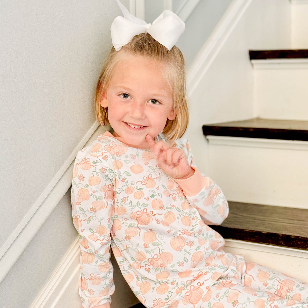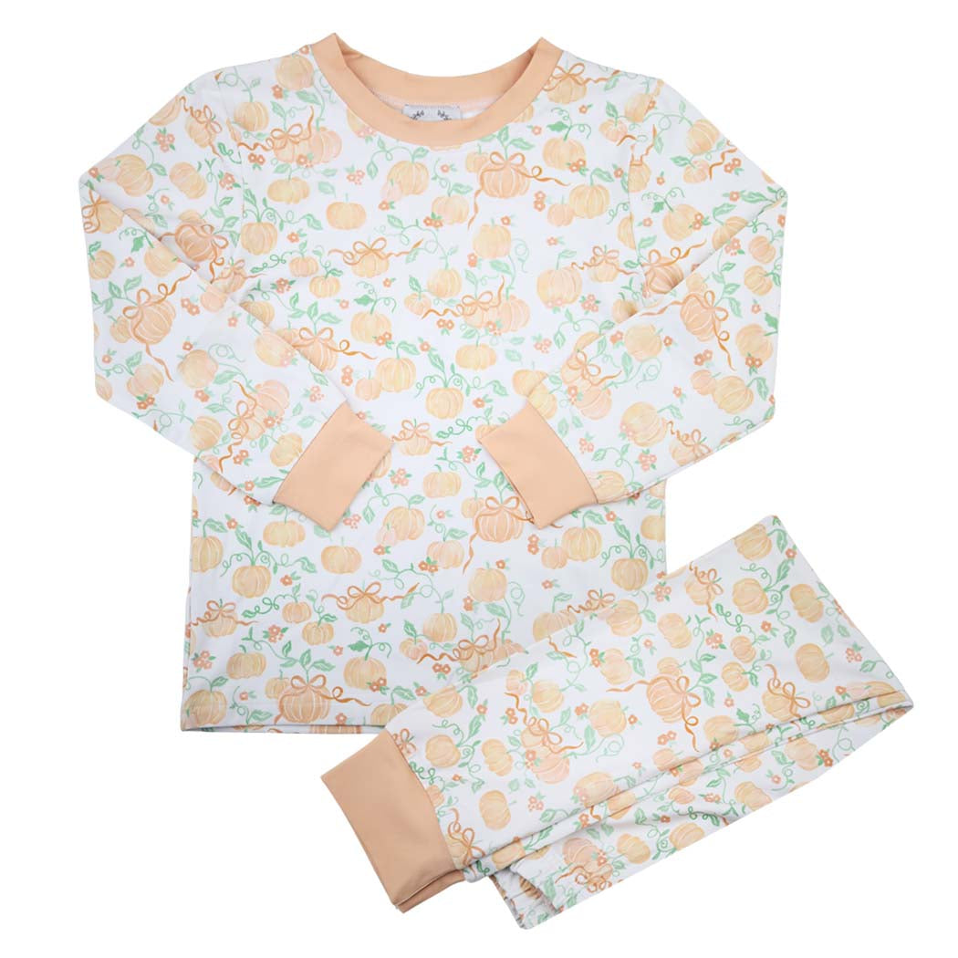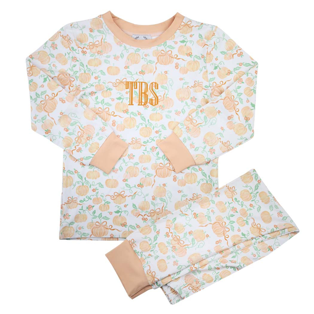 This feminine floral pumpkin design is the perfect print for your little lady this Fall. The soft knit loungewear set features hues of pastel brown, orange, and green. The collar and ankles are trimmed in coordinating pastel orange.