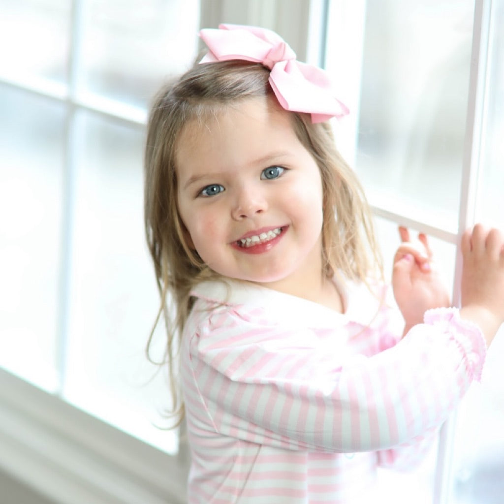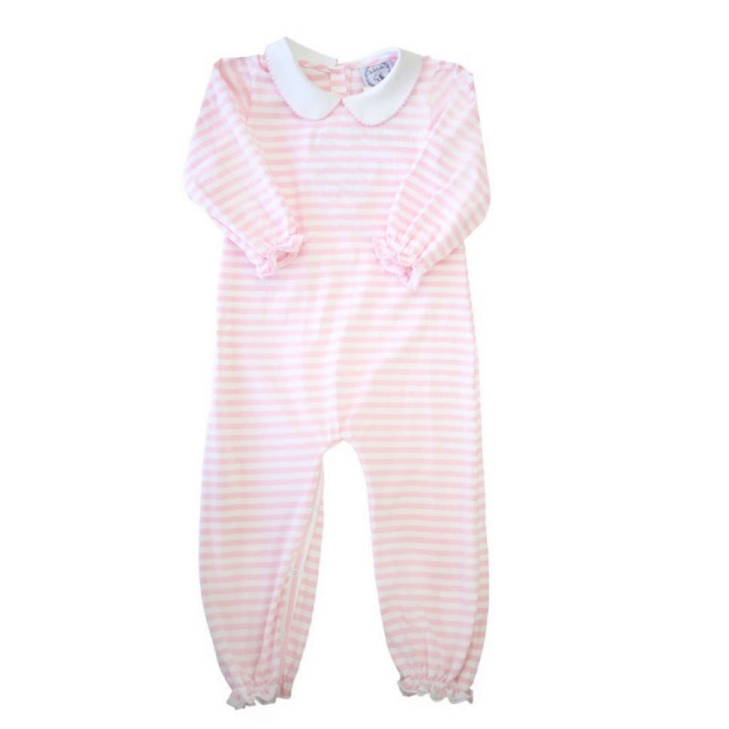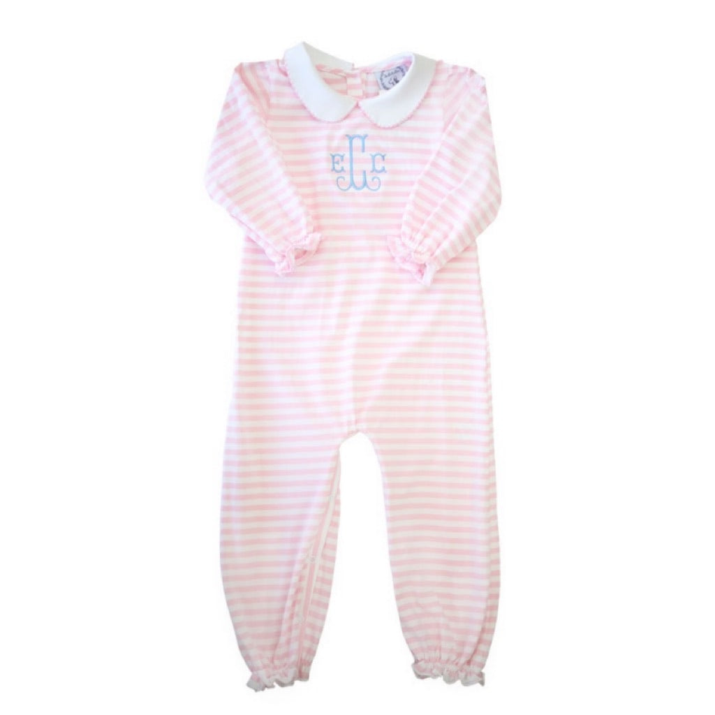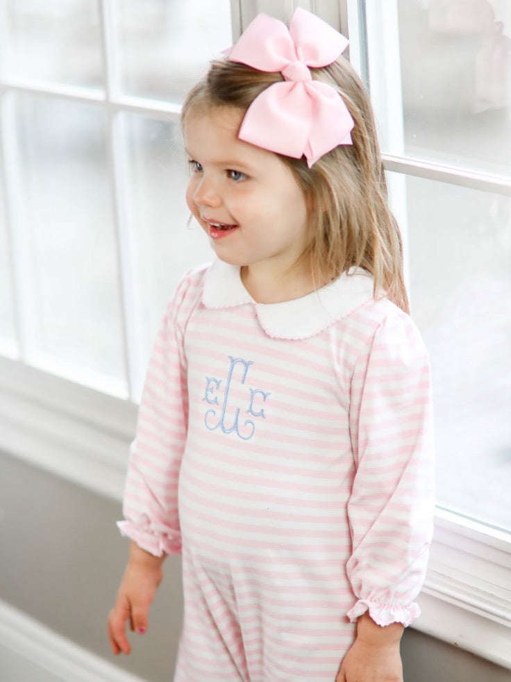 We’ve got stripe fever! And these sweet little rompers make us giddy! Why do we love them? They’re made from the softest knit cotton with either baby pink or baby blue stripes. Peter Pan collars are trimmed in the coordinating colors there are snaps at the legs for easy diaper changing.