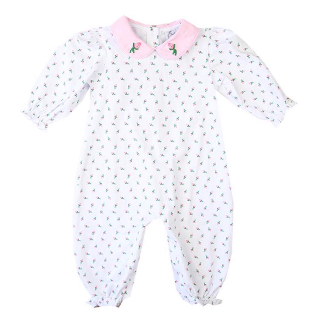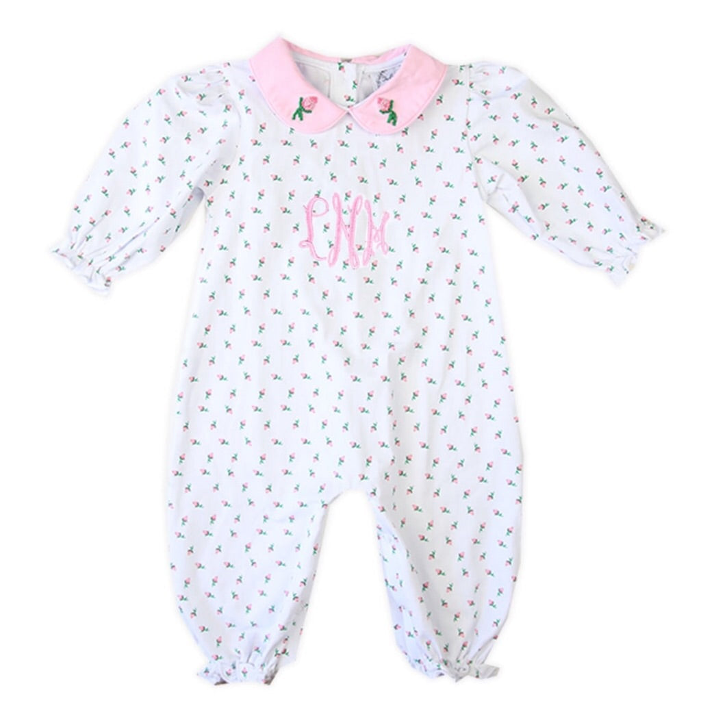 This adorable romper for baby girls is made from incredibly soft knit cotton. Pink knit fabric lines the sleeves, ankles and Peter Pan collar. A French knotted rosebud appears on each of the collars. Add a monogram or name to make it extra sweet! Looking for a gift for a new baby? This is a favorite of many new and expecting moms!
