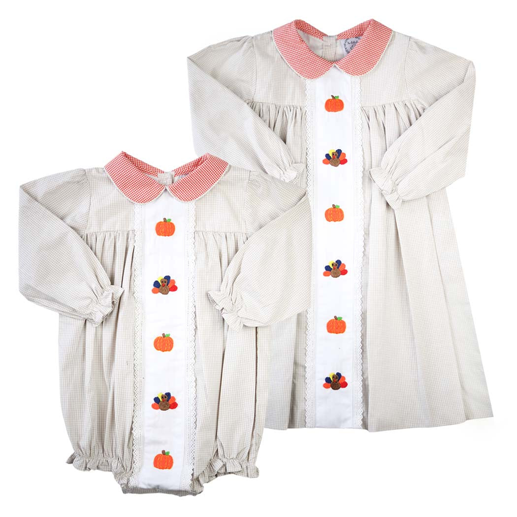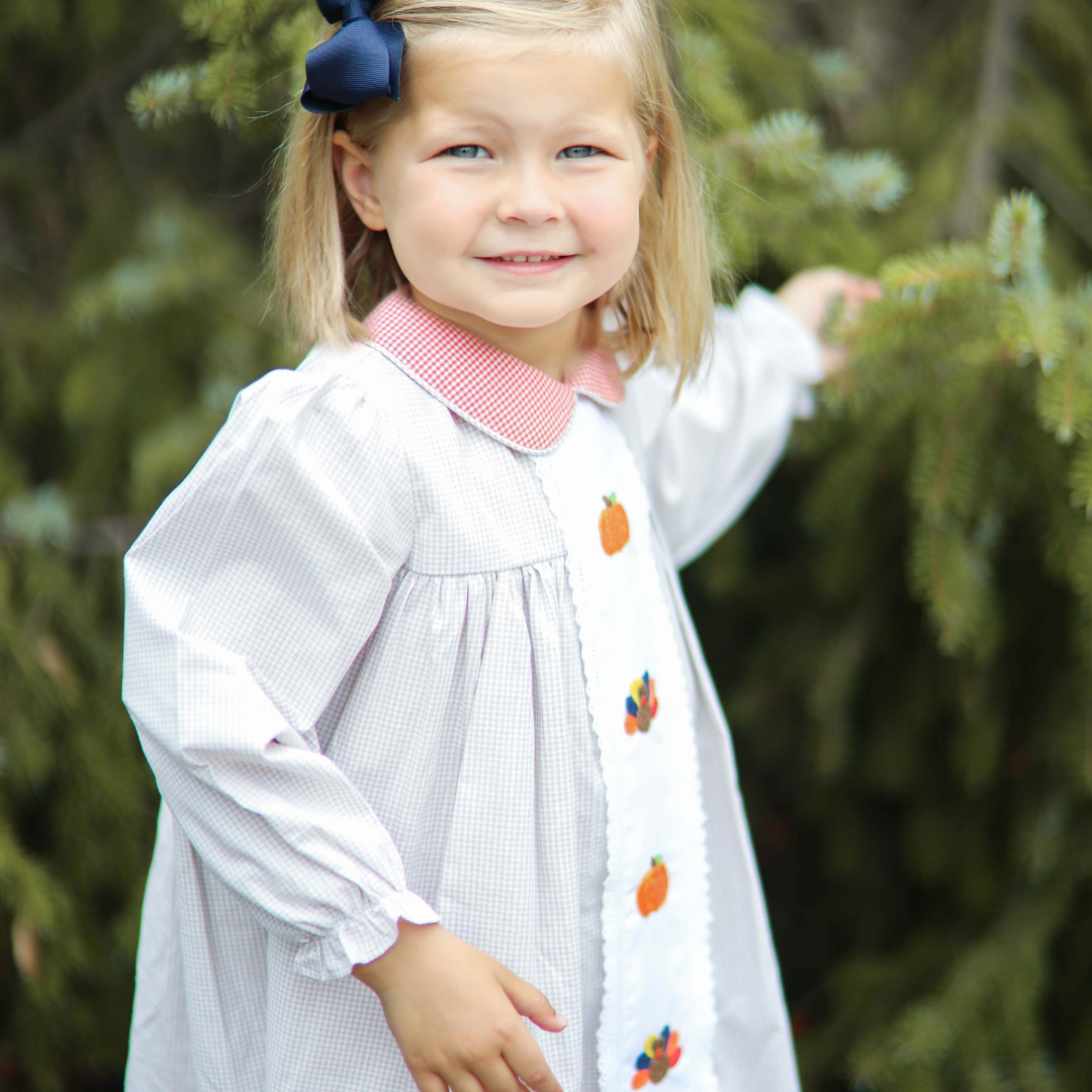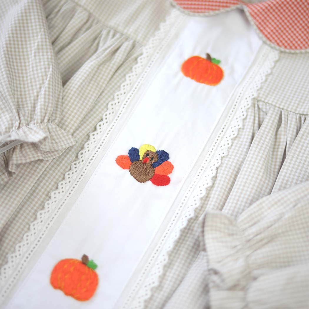 This darling dress is constructed of light brown gingham fabric and features hand embroidered  orange pumpkins and colorful turkeys. Orange gingham fabric can be found on the Peter Pan collar and lace lines the center of the dress. Add a bow to her hair and you’ve got the sweetest little dress for Thanksgiving supper and more!
