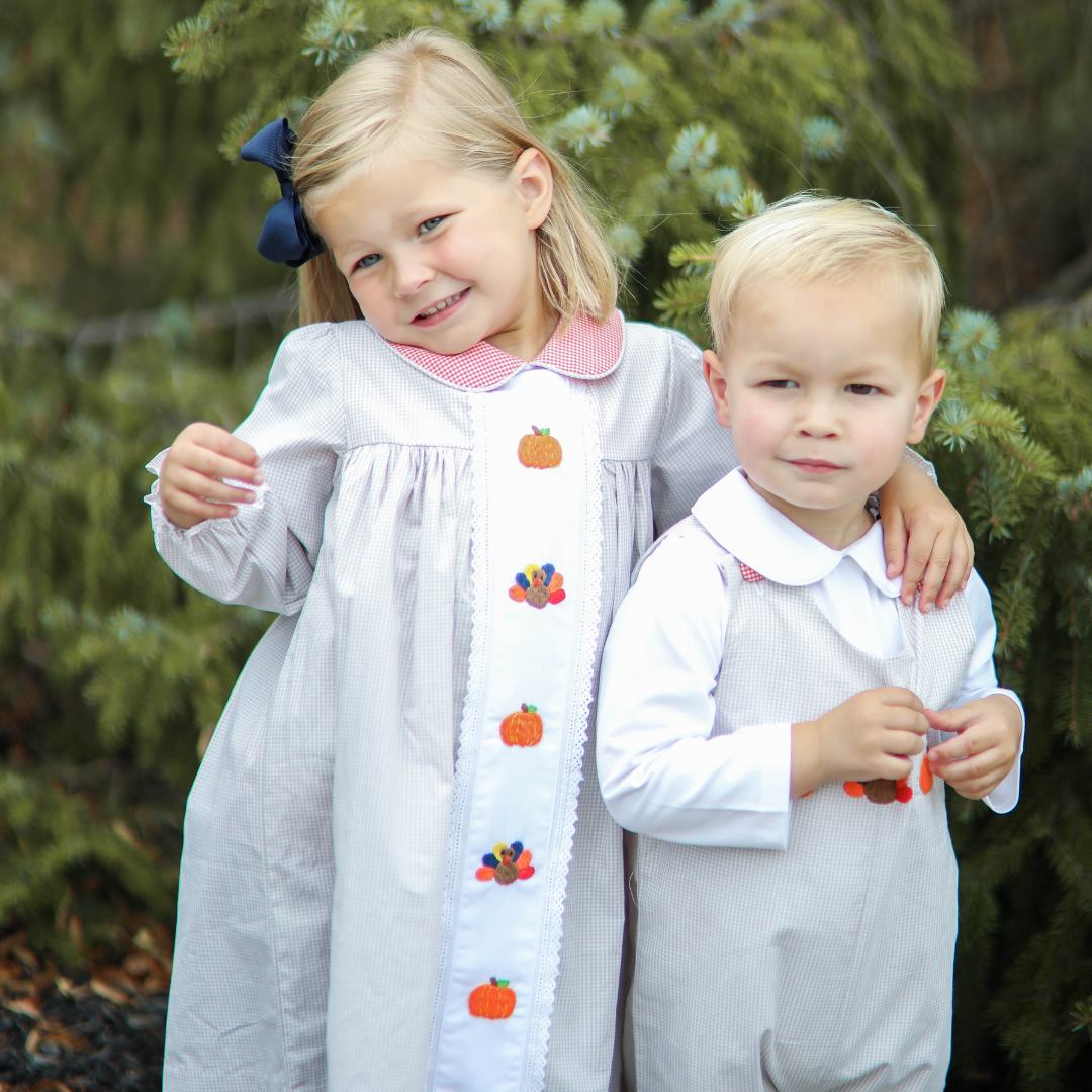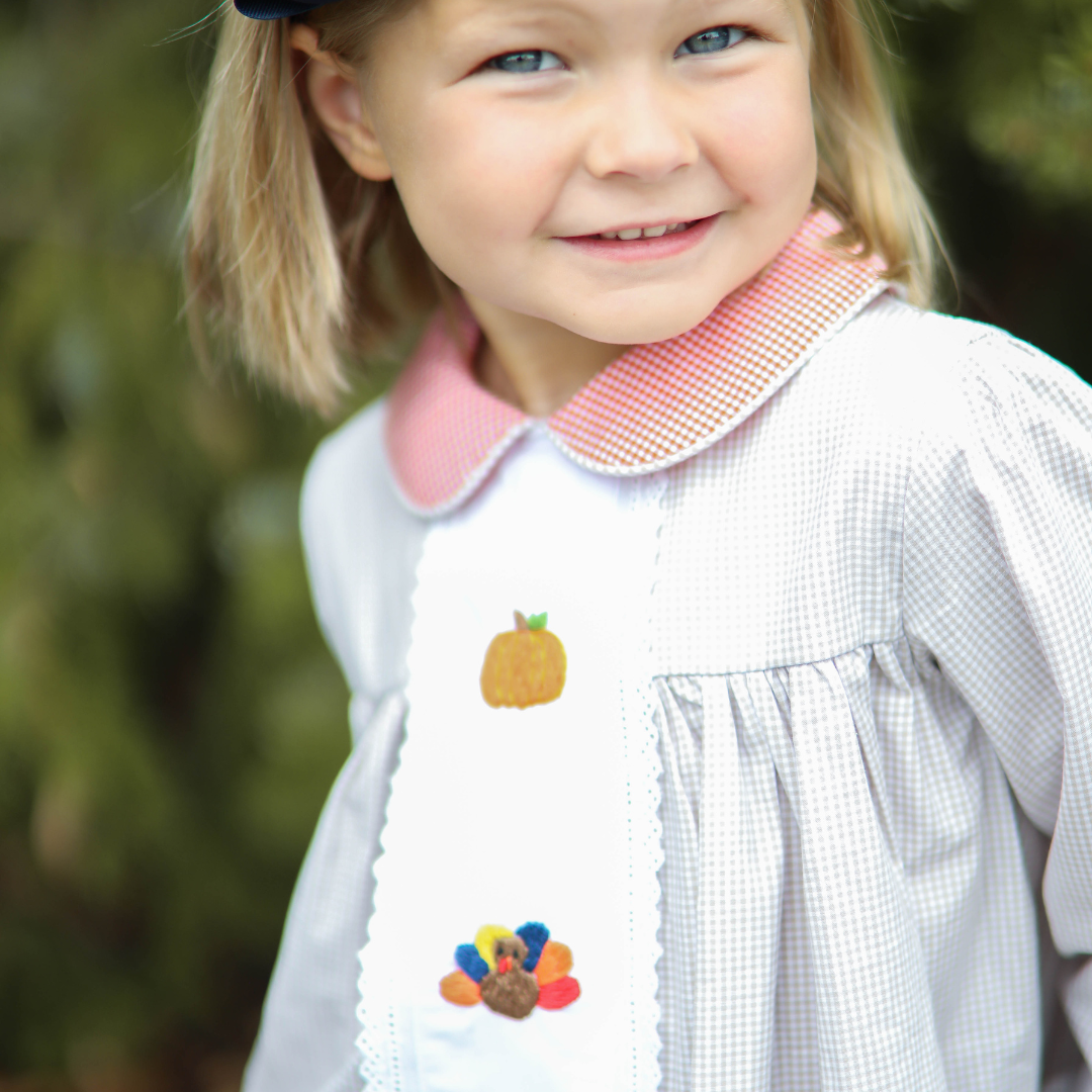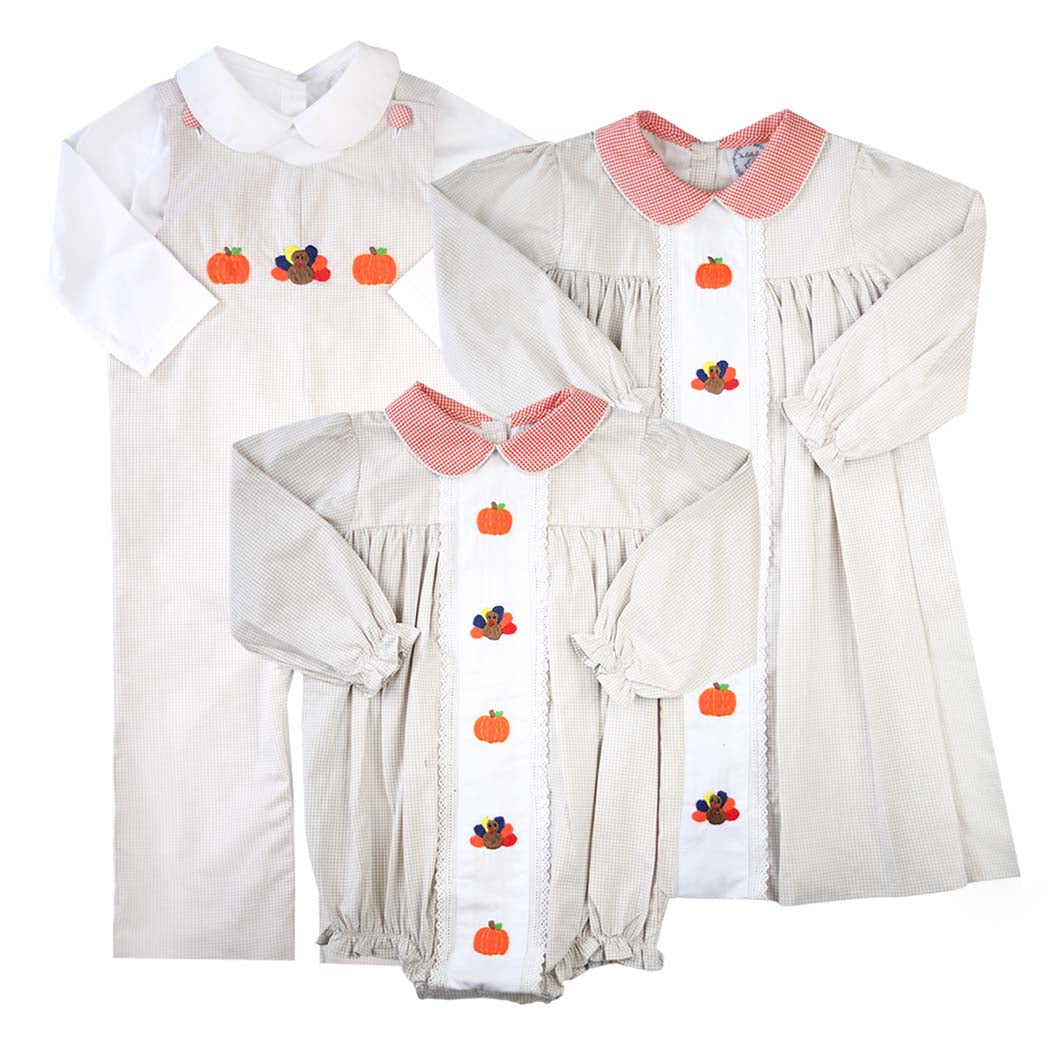 This darling dress is constructed of light brown gingham fabric and features hand embroidered  orange pumpkins and colorful turkeys. Orange gingham fabric can be found on the Peter Pan collar and lace lines the center of the dress. Add a bow to her hair and you’ve got the sweetest little dress for Thanksgiving supper and more!