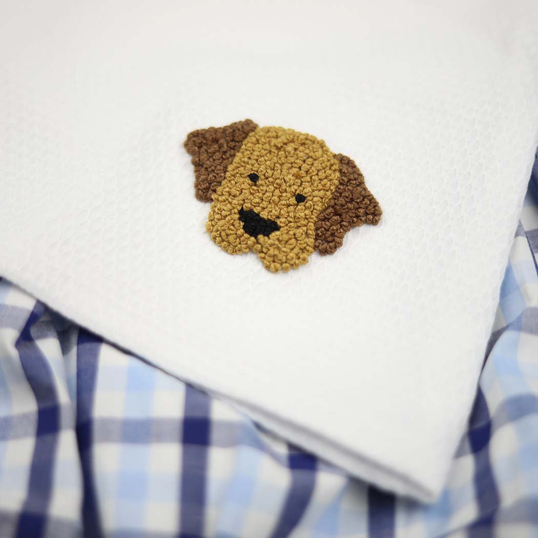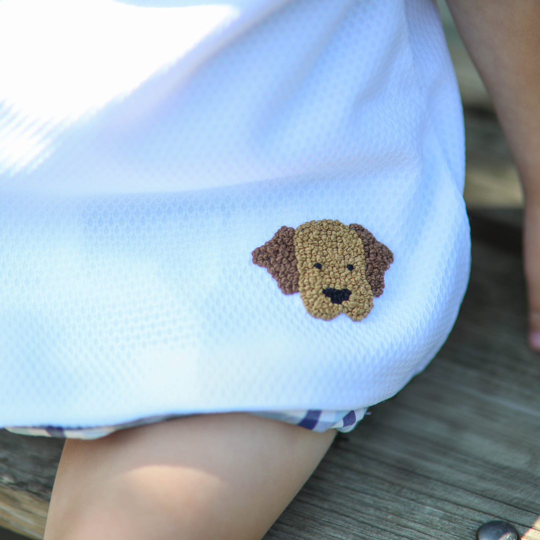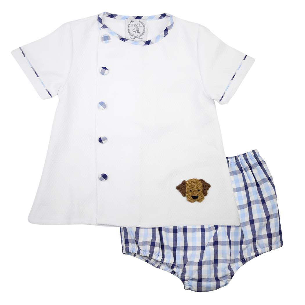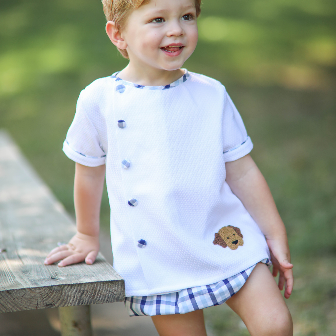 Made from incredibly soft white honeycomb cotton, this precious bloomer set features a french-knotted puppy at the hem. There’s baby blue and navy plaid piping at the collar and arm openings. Asymmetric buttons line the front for easy changing. Matching bloomer bottoms are included in the set.