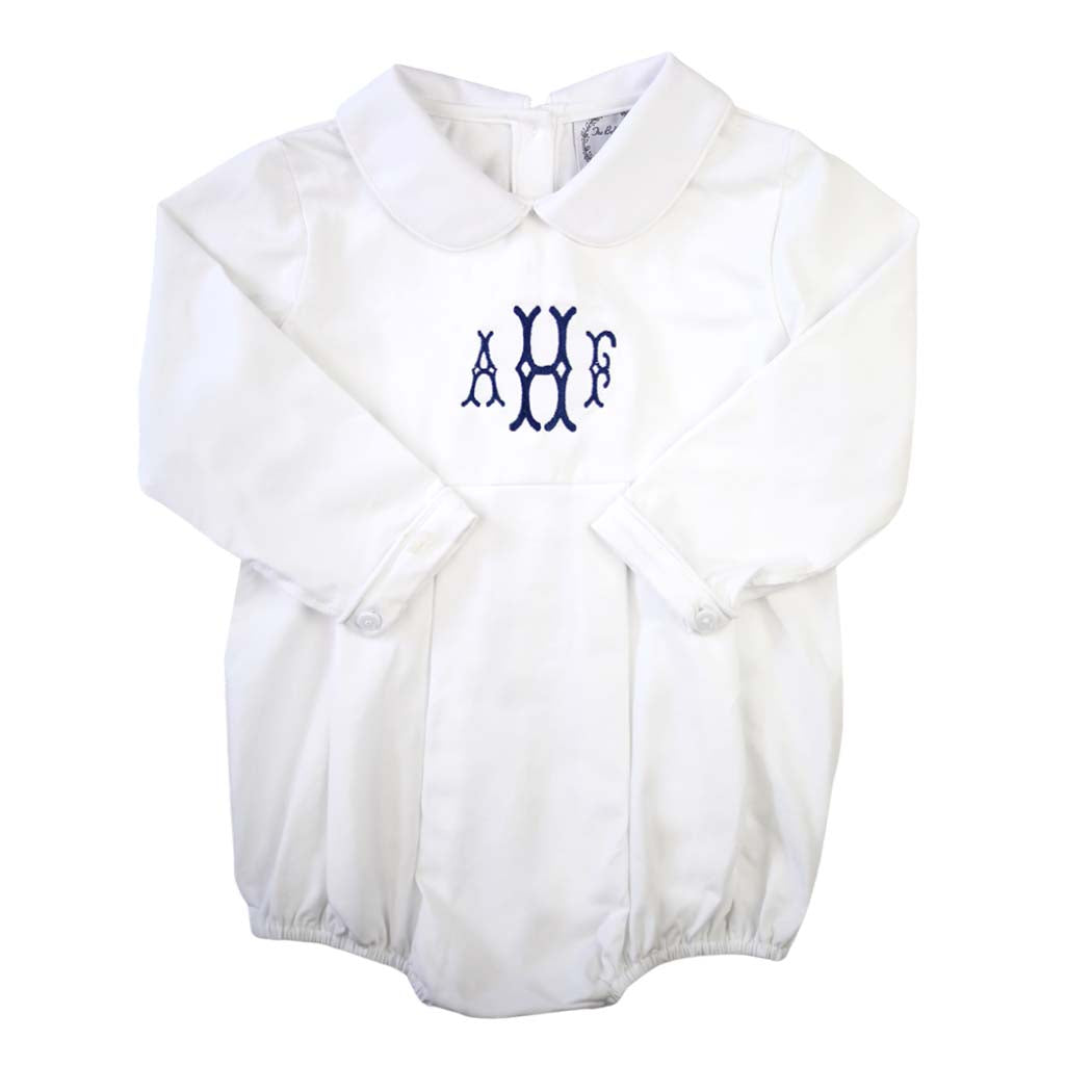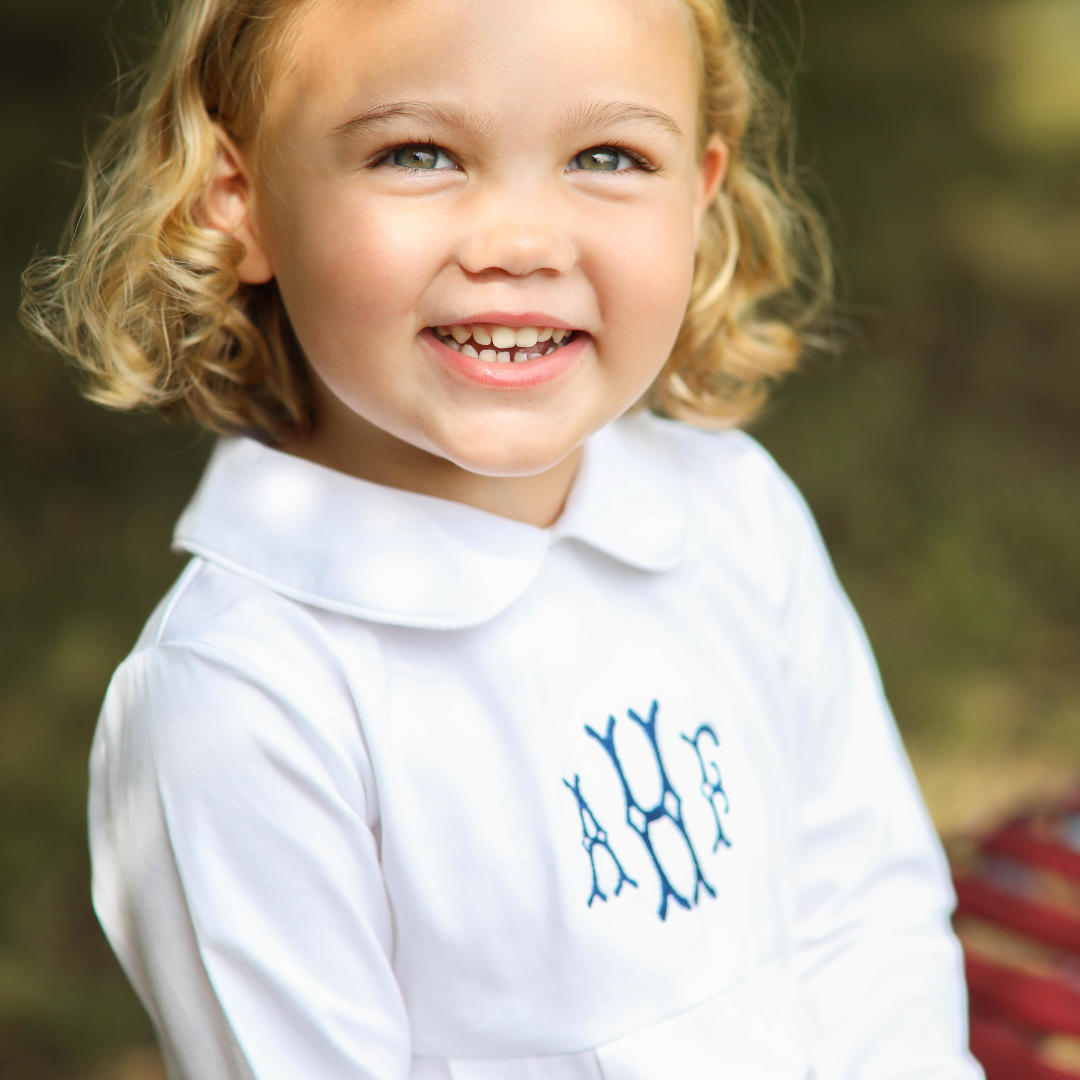 We sure do love a classic Peter Pan collar shirt and we’re excited to be offering a classic long-sleeve bodysuit version for the littlest ones in your life! Made from the softest knit fabric and it can be made extra special by adding a monogram to the chest. Shop this adorable item in four colors: white, light pink, navy, light blue, and lavender.