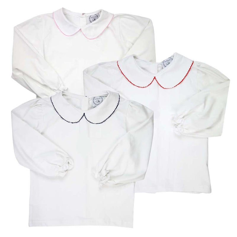 Pink Picot Trim Long Sleeve Peter Pan White Knit Shirt