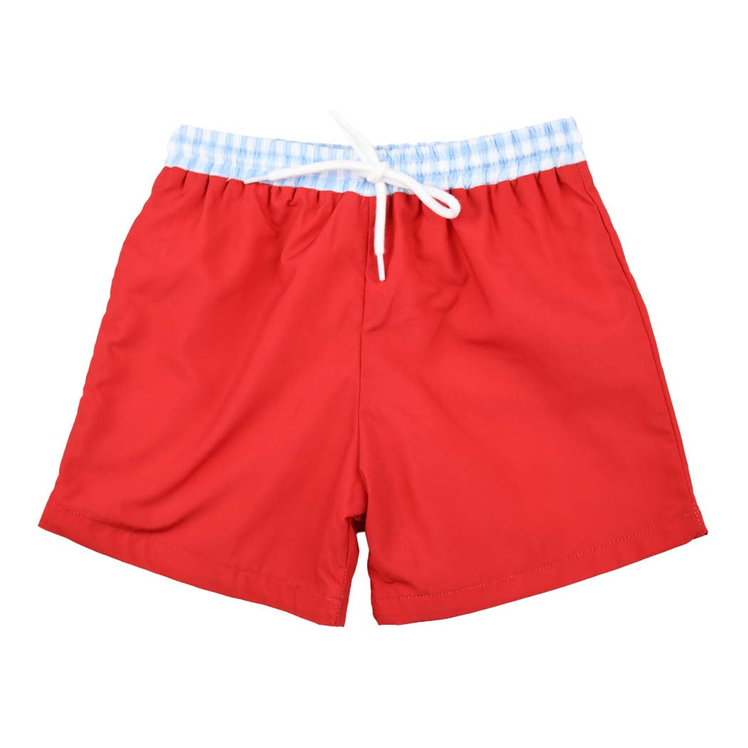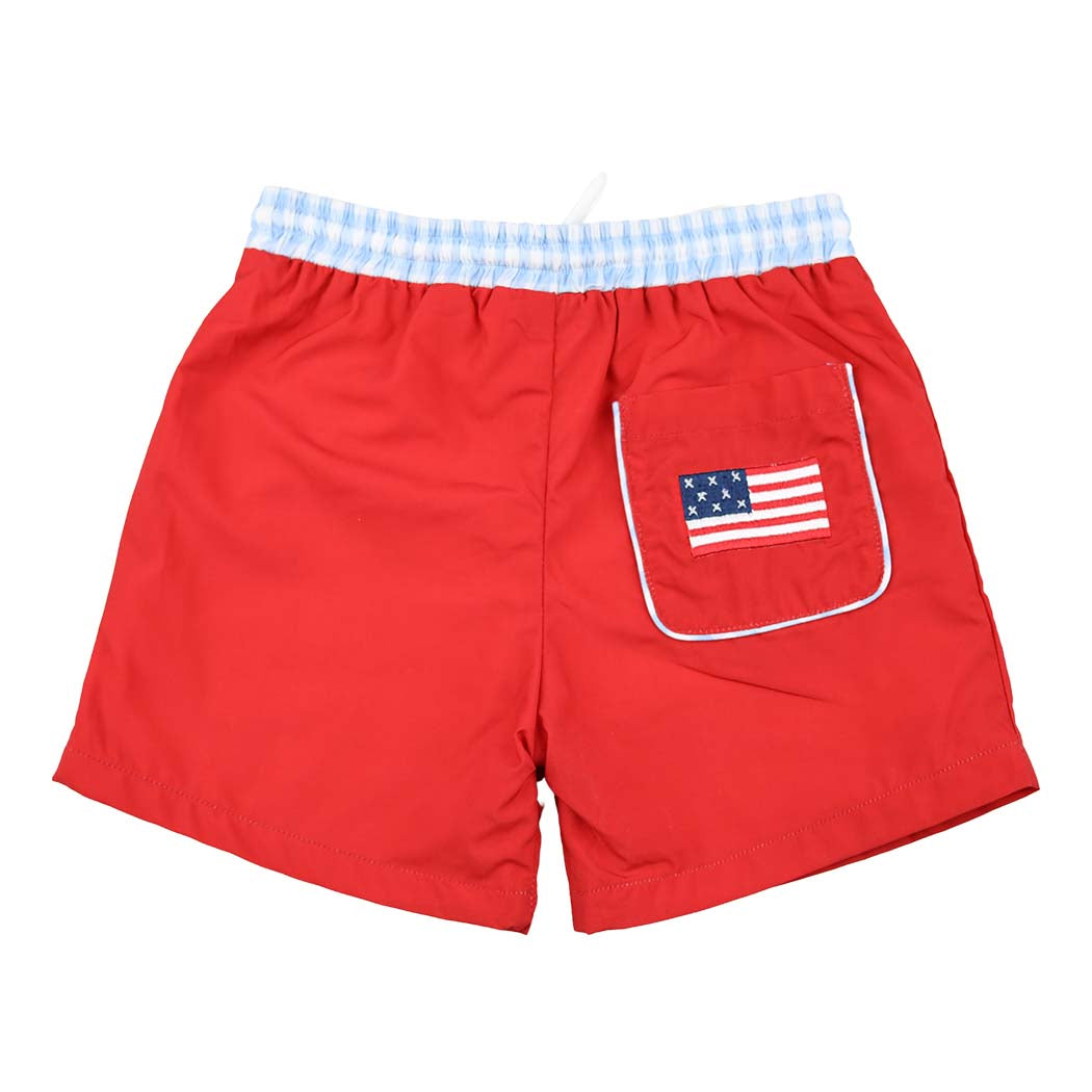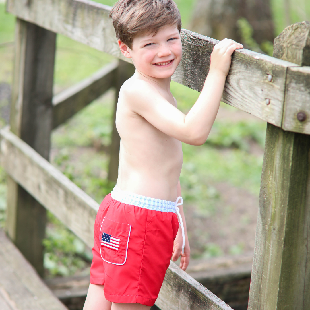 The boys patriotic flag swim trunks are a fun and festive choice for summer splashing. Featuring a bold red hue, these trunks are perfect for pool days, beach adventures, and celebrating in all-American style. Comfortable, durable, and ready for every wave!