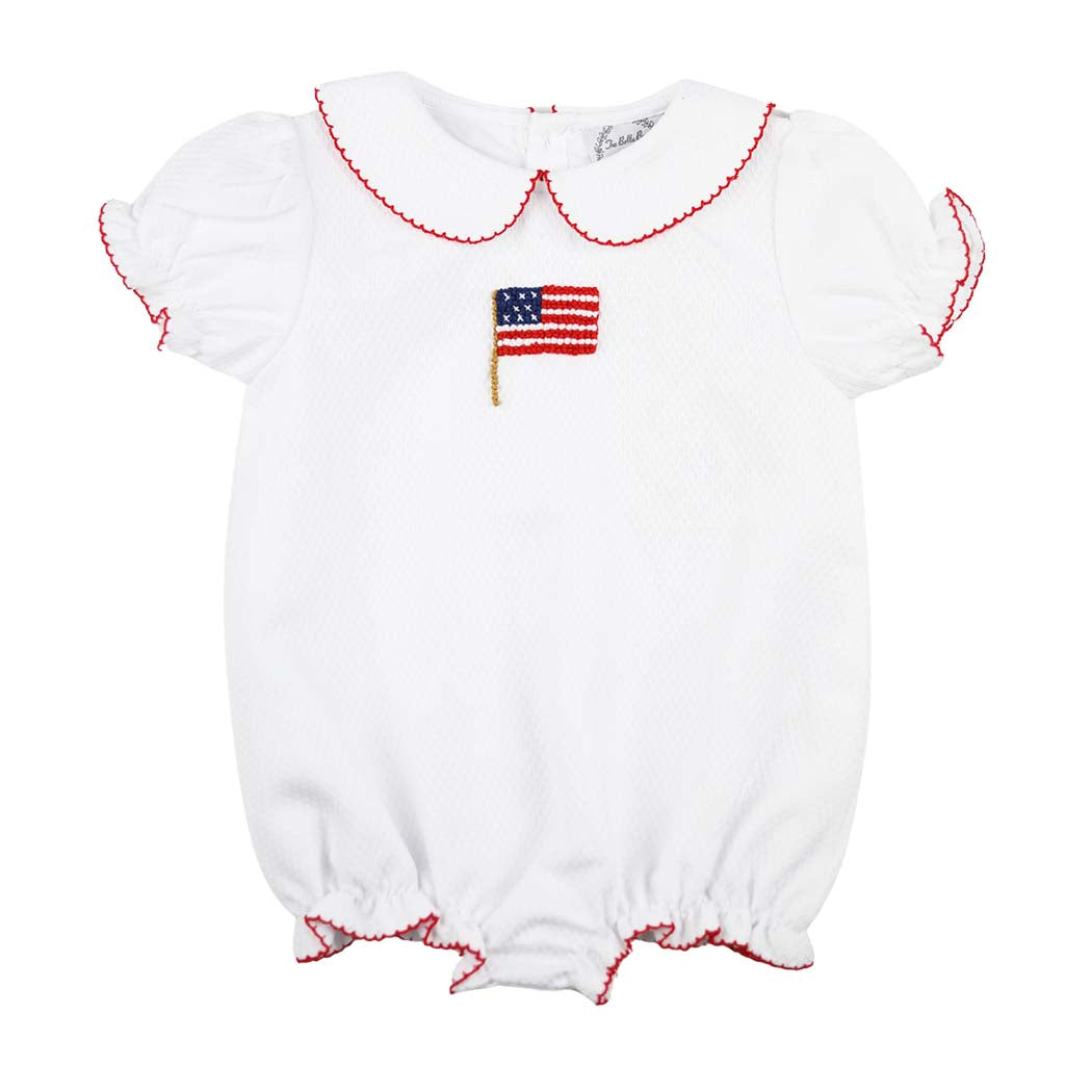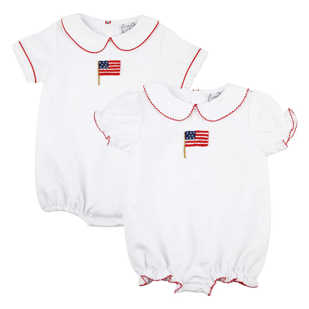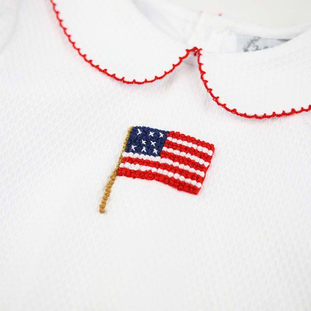 Show off her patriotic pride with this Girls Patriotic Honeycomb Flag Bubble! Featuring beautifully detailed white honeycomb fabric and French Knotted American flag, this classic bubble is perfect for summer holidays, family gatherings, and picture-perfect moments all season long. This girl version features red picot trim on the collar, sleeves, and leg openings.