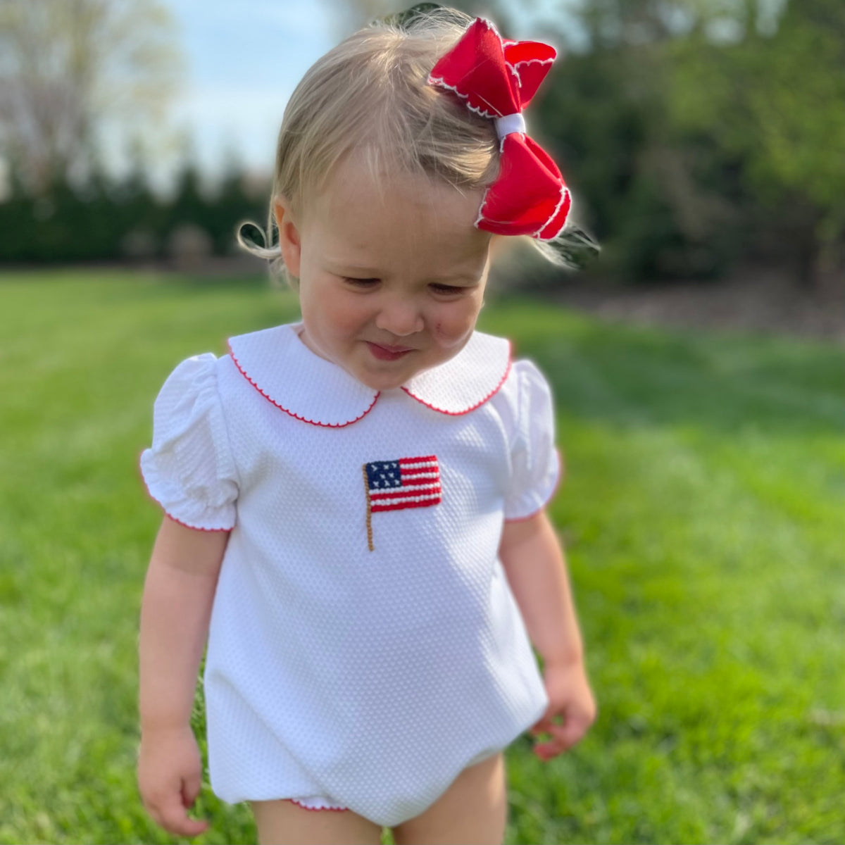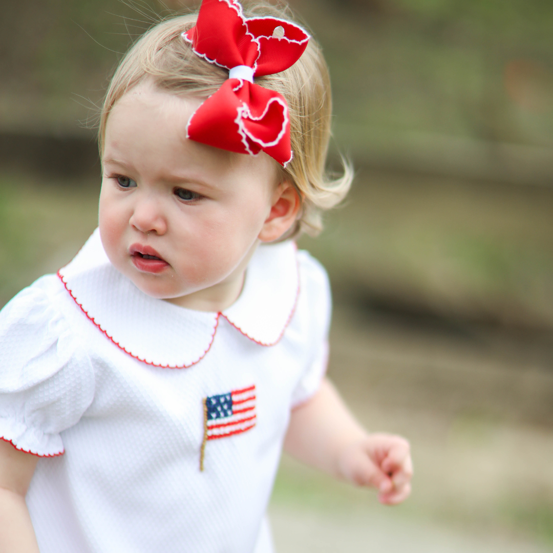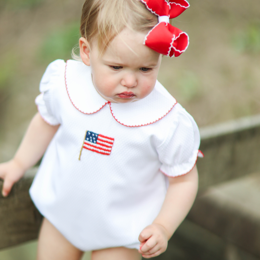Show off her patriotic pride with this Girls Patriotic Honeycomb Flag Bubble! Featuring beautifully detailed white honeycomb fabric and French Knotted American flag, this classic bubble is perfect for summer holidays, family gatherings, and picture-perfect moments all season long. This girl version features red picot trim on the collar, sleeves, and leg openings.