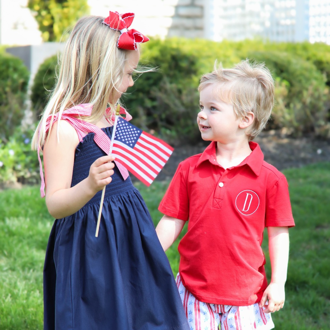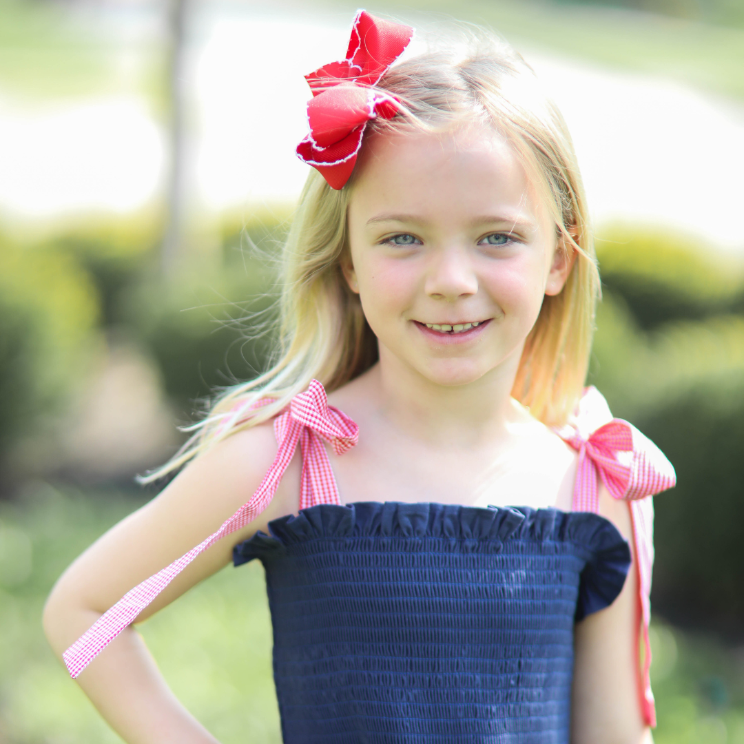 This navy oxford smocked patriotic dress is a timeless summer essential. Featuring a classic navy oxford fabric, it has beautiful smocking at the chest and coordinating red gingham ties at the shoulders that are completely adjustable. This twirl-worthy dress is perfect for celebrating Memorial Day, the Fourth of July, and all your sunny day adventures with patriotic flair.