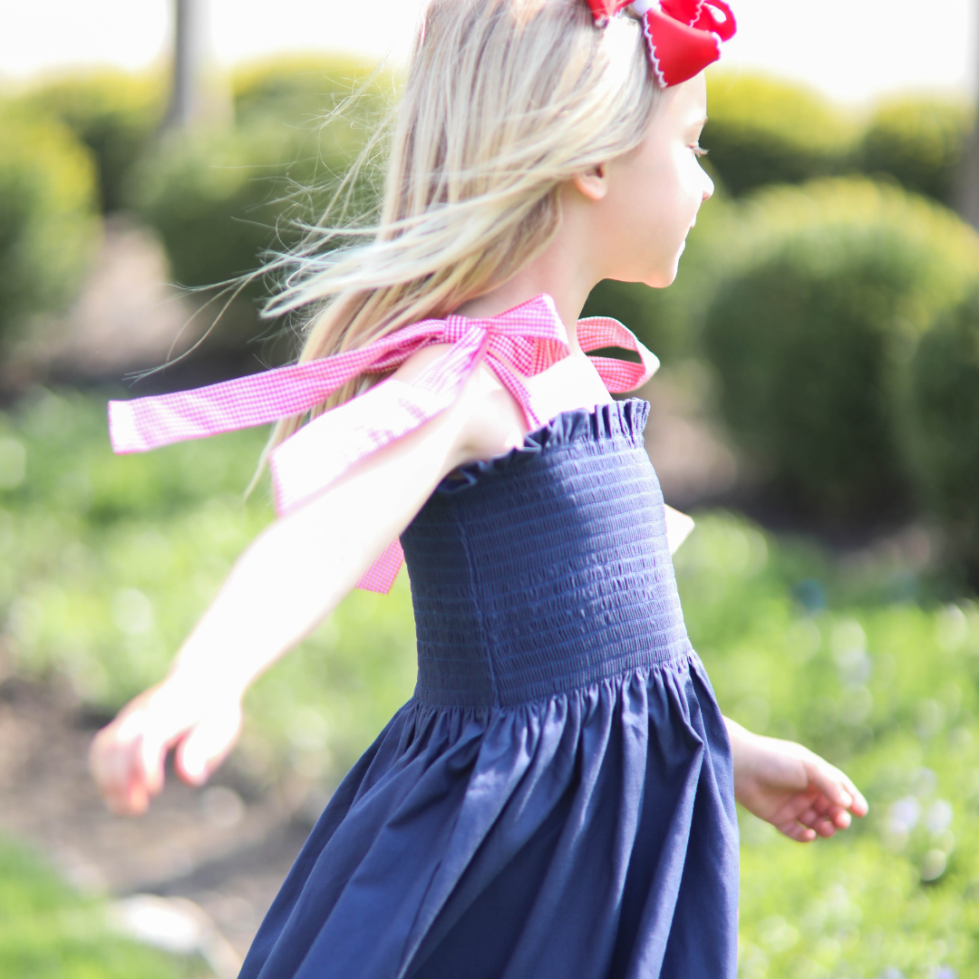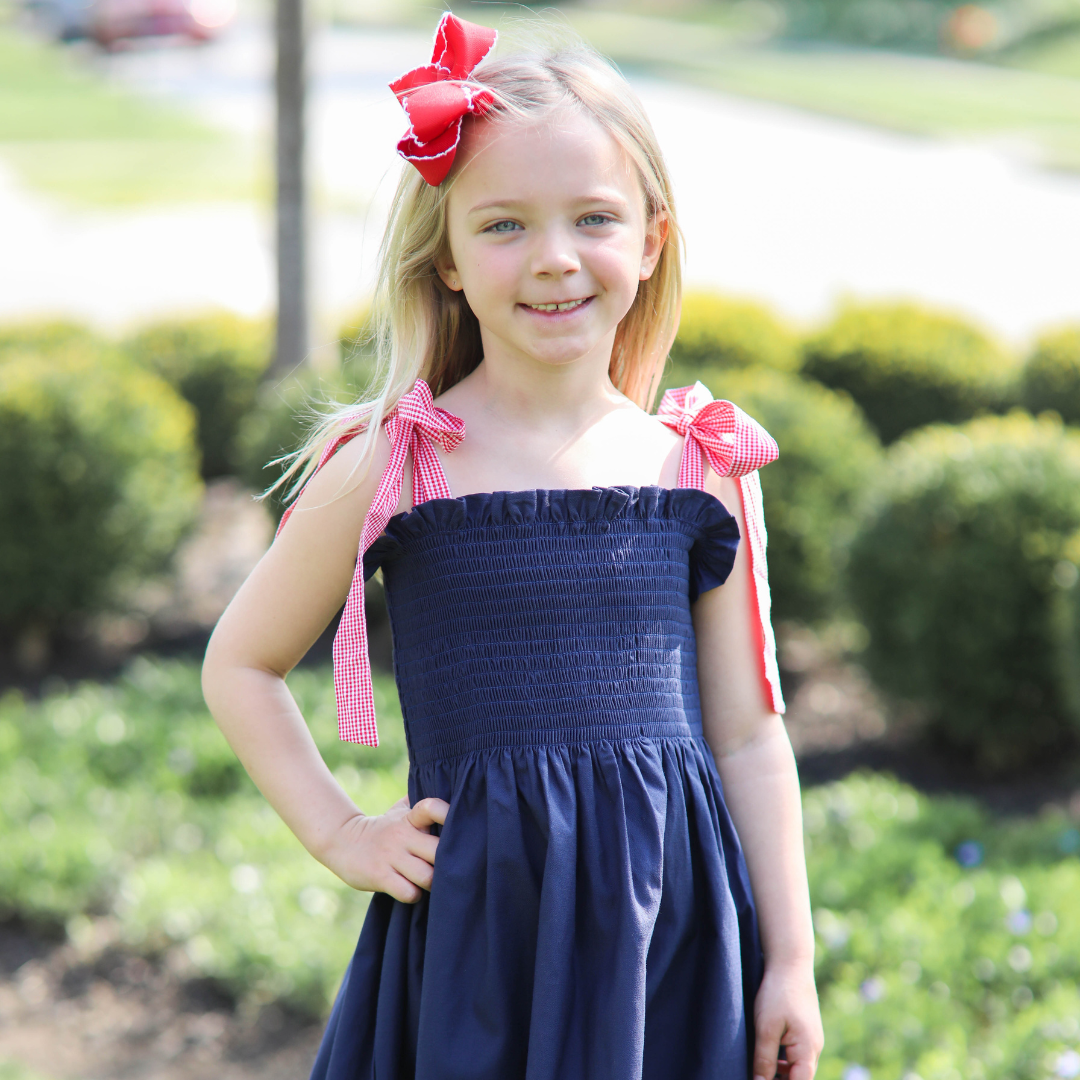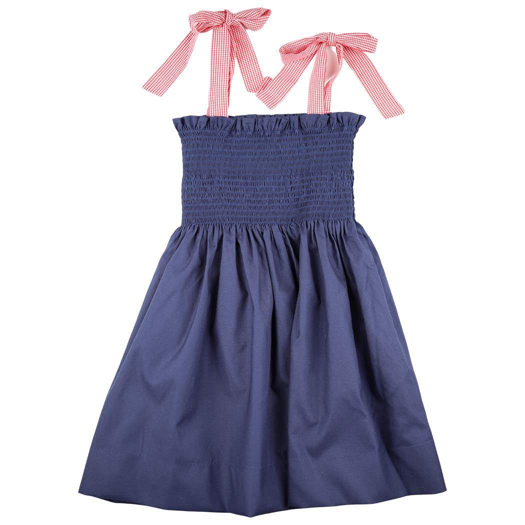 Girls Navy Smocked Dress with Gingham Tie Straps