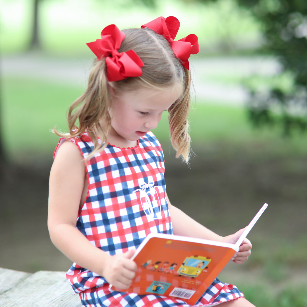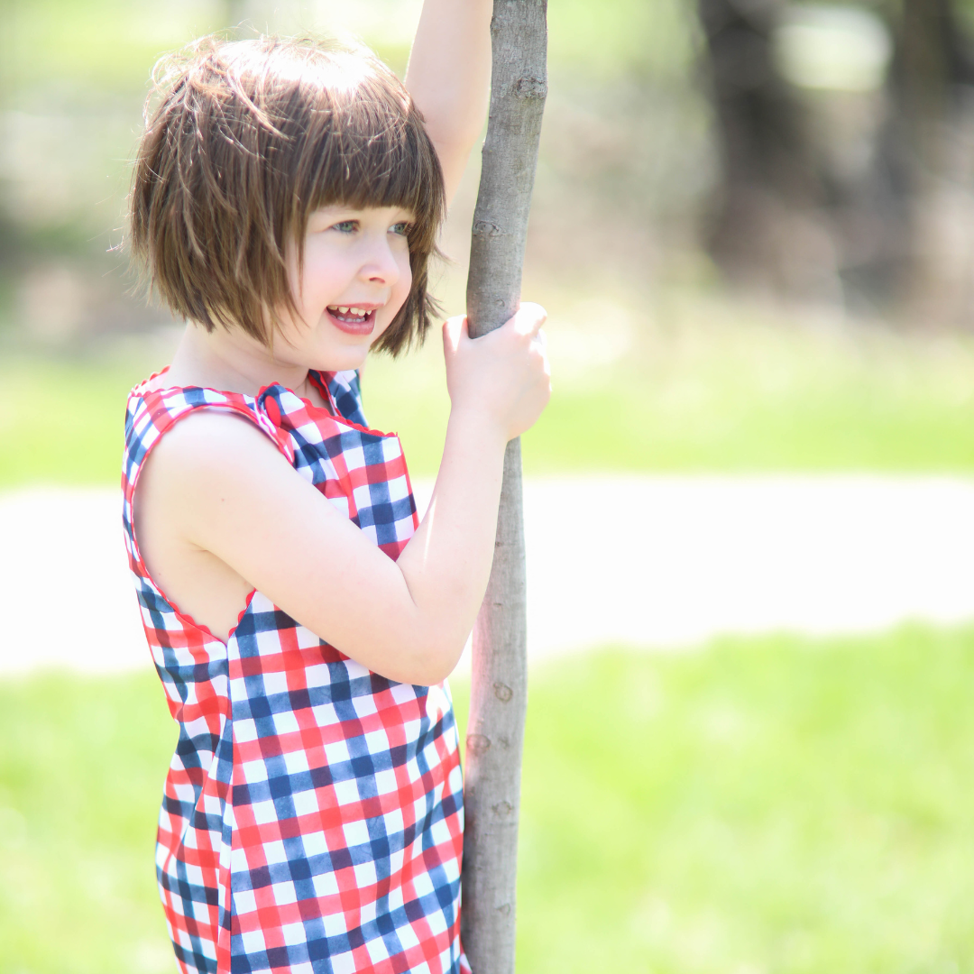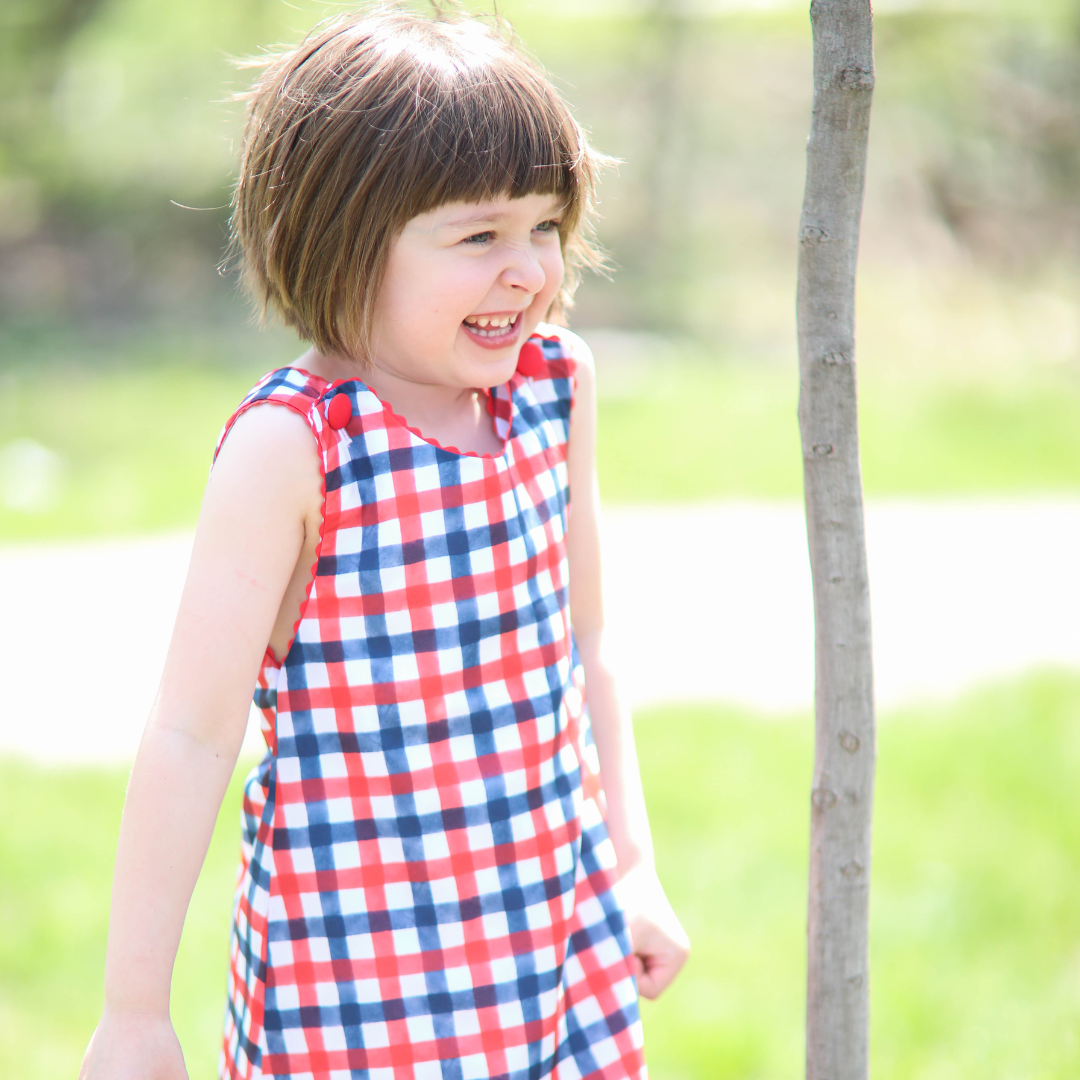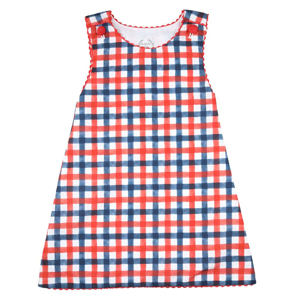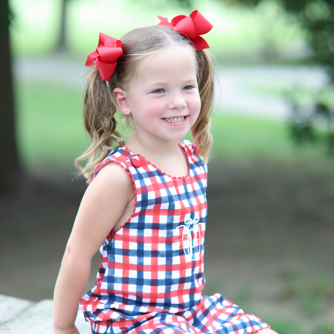 This classic red and blue gingham patriotic sun dress is a timeless summertime favorite. With classic gingham fabric, matching red ric rac, and festive red and blue details, this sweet style is perfect for keeping cool during warm weather celebrations like Memorial Day and the Fourth of July.