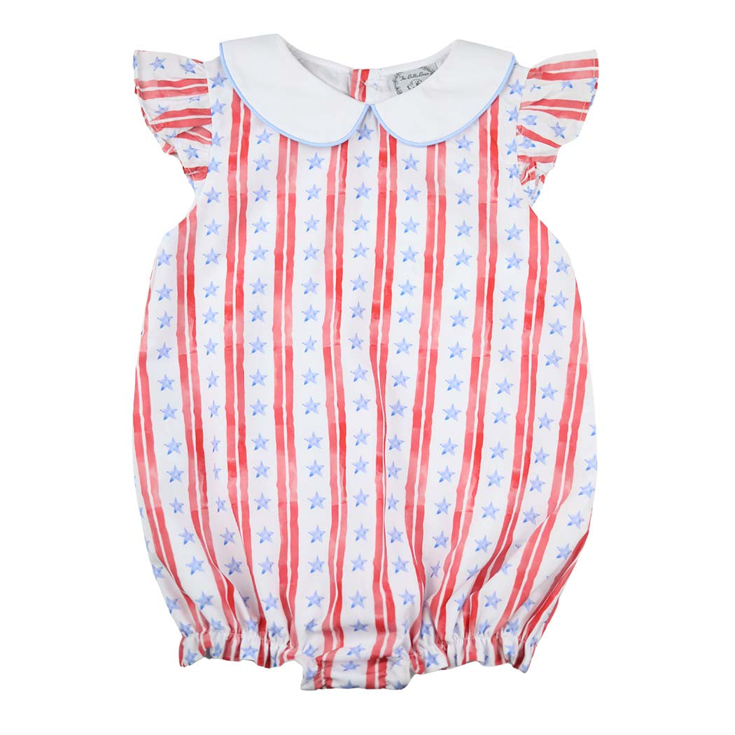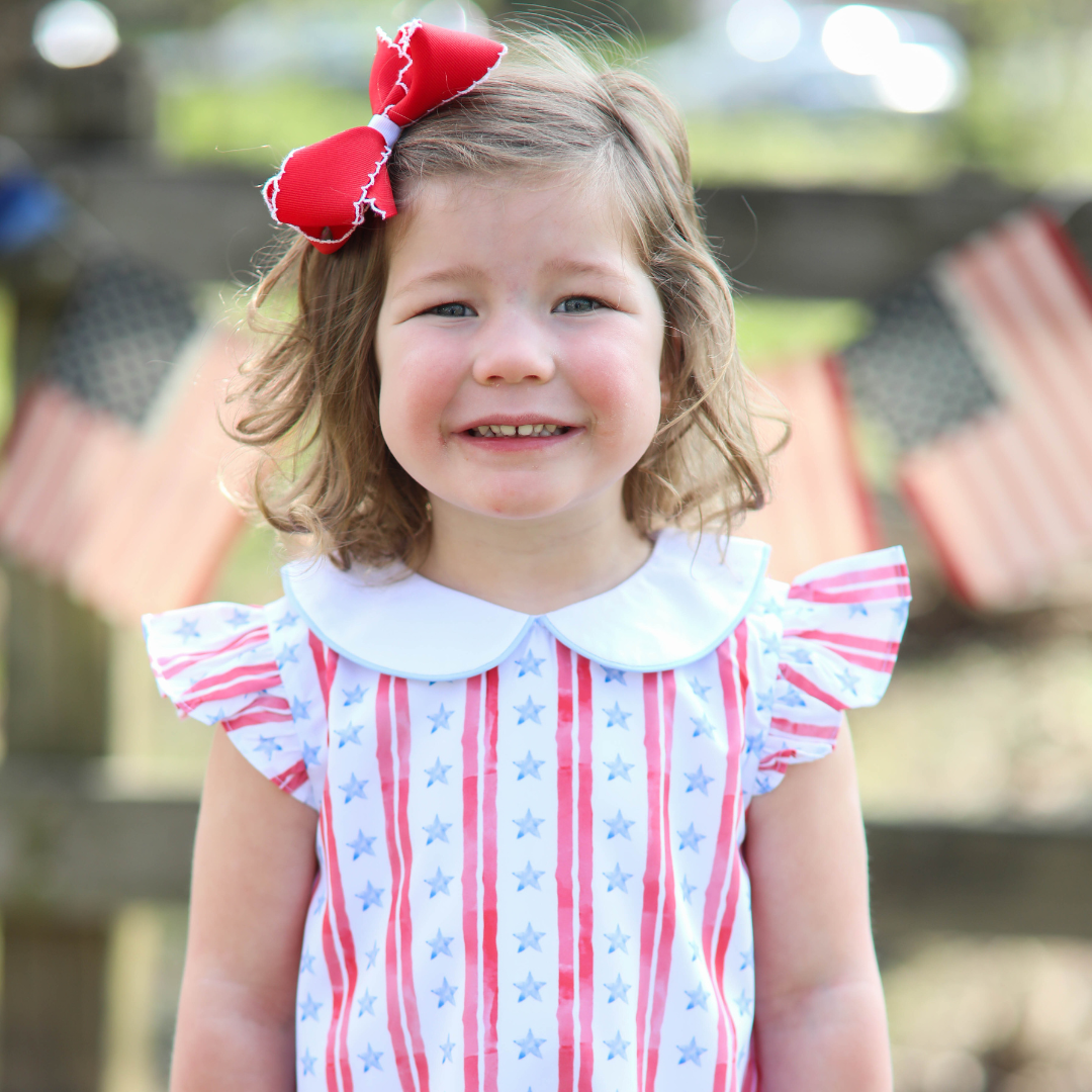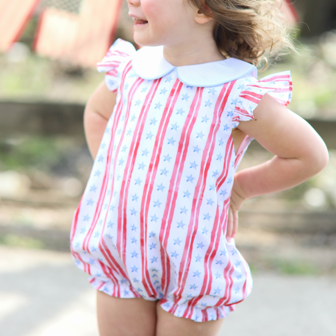 Bursting with patriotic charm, this Girls Patriotic Star Bubble is perfect for summer celebrations! Featuring a sweet star and stripe design, this classic red, white, and blue details is a festive must-have for Memorial Day, the Fourth of July, and all your warm-weather adventures.