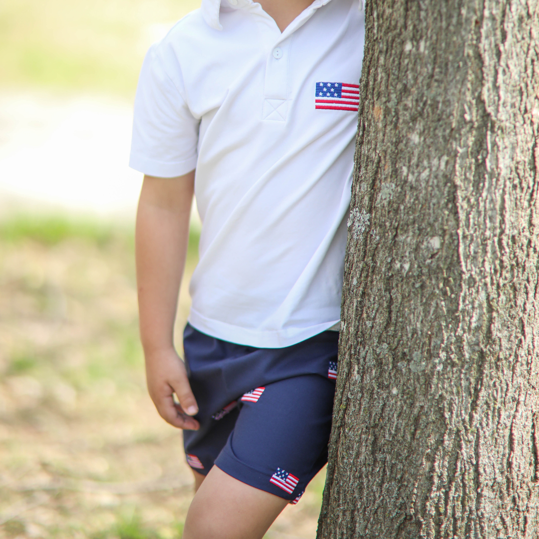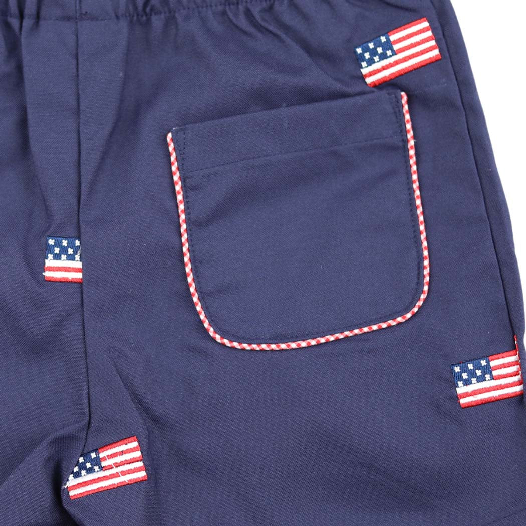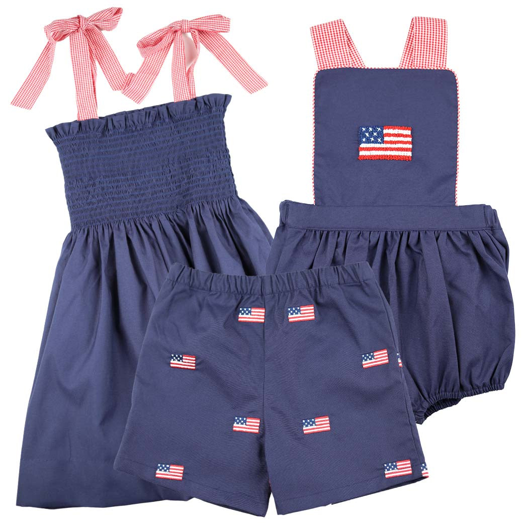These patriotic embroidered flag shorts are perfection! Featuring a bold red, white, and blue American flags, these comfortable and playful shorts have a back pocket that is trimmed in coordinating red gingham. Grab them today for those parades, backyard BBQs, and celebrating all of your favorite patriotic holidays in style.