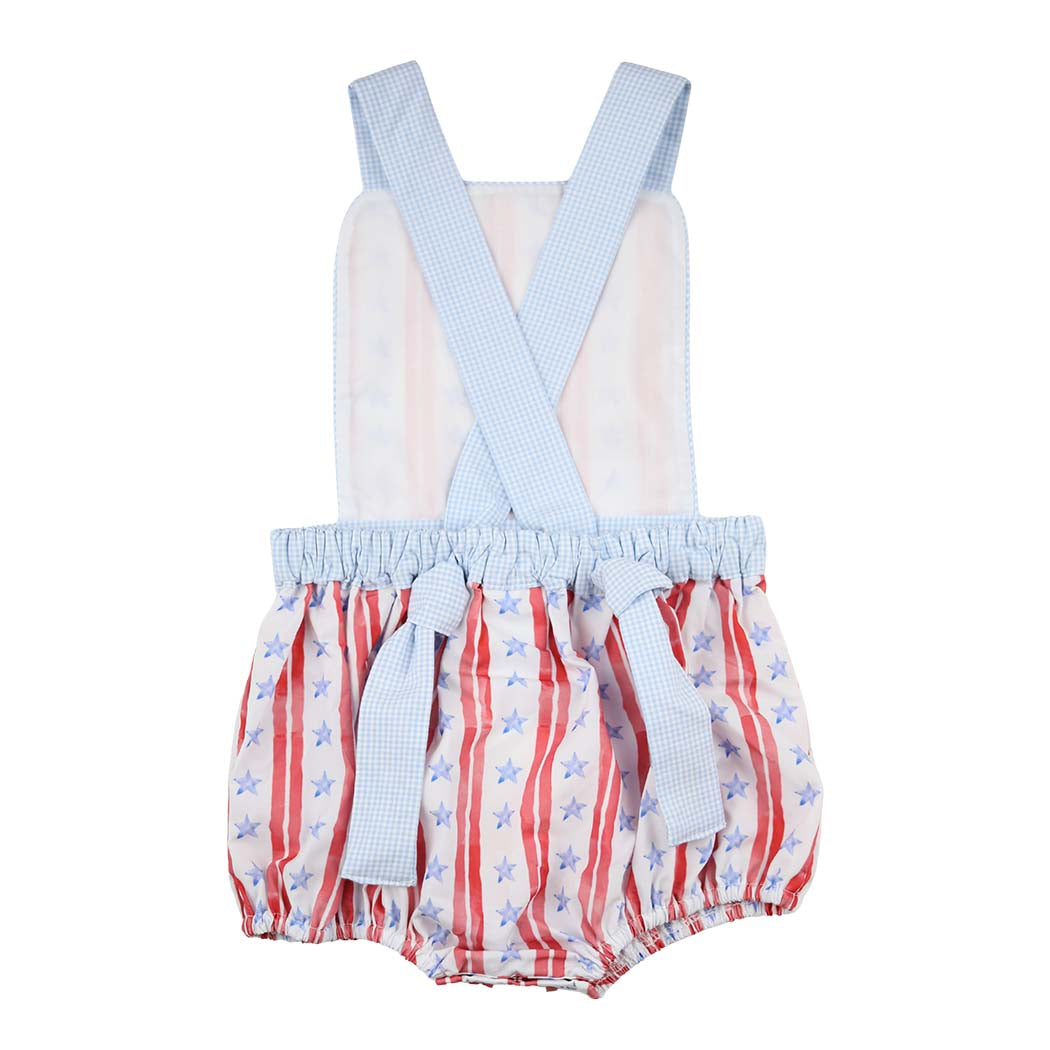 Celebrate in stars and style with this Patriotic Star Sunsuit Bubble! Featuring classic red, white, and blue with sweet star embroidery, this bubble is perfect for Memorial Day, the Fourth of July, and all your summer celebrations. A must-have for your little firecracker!