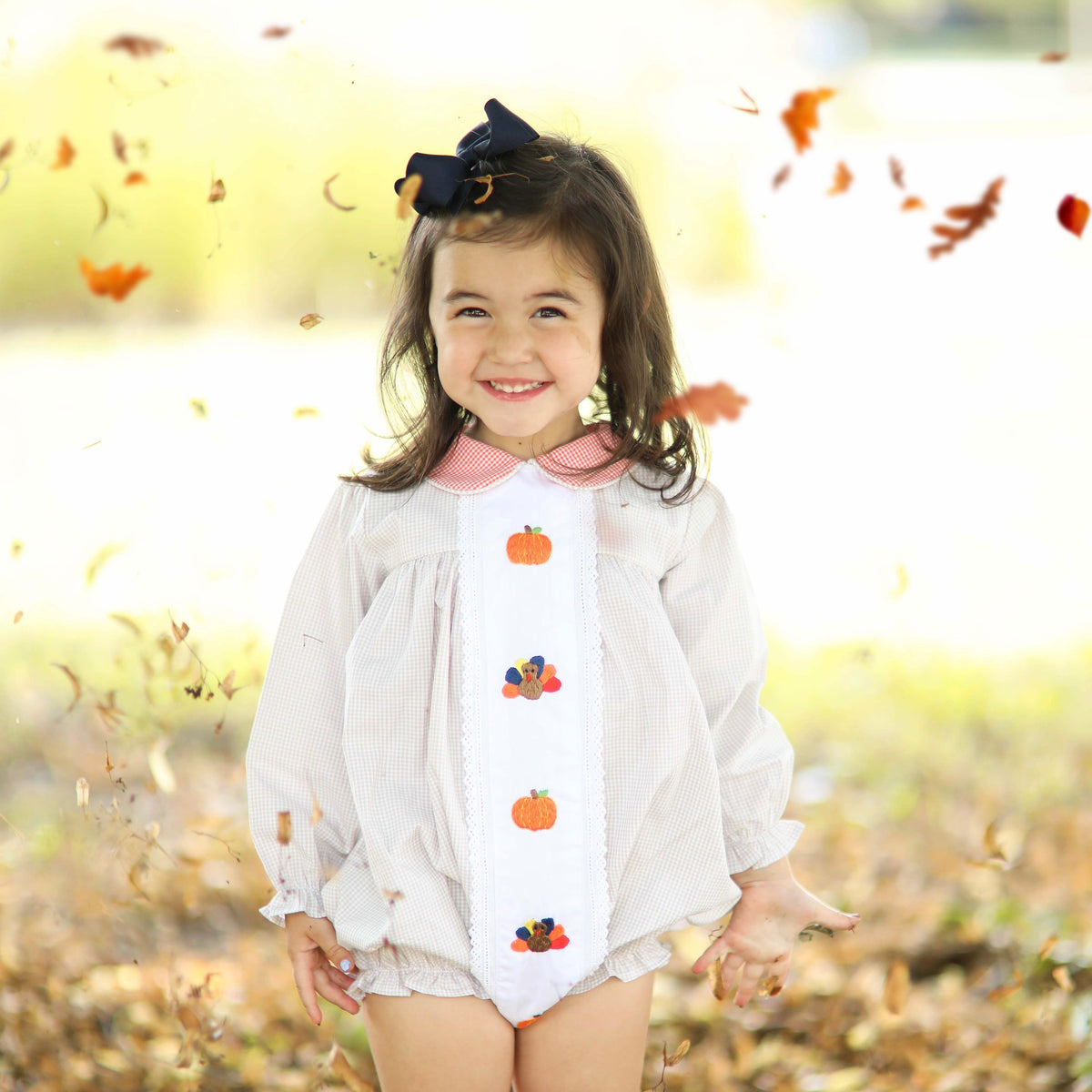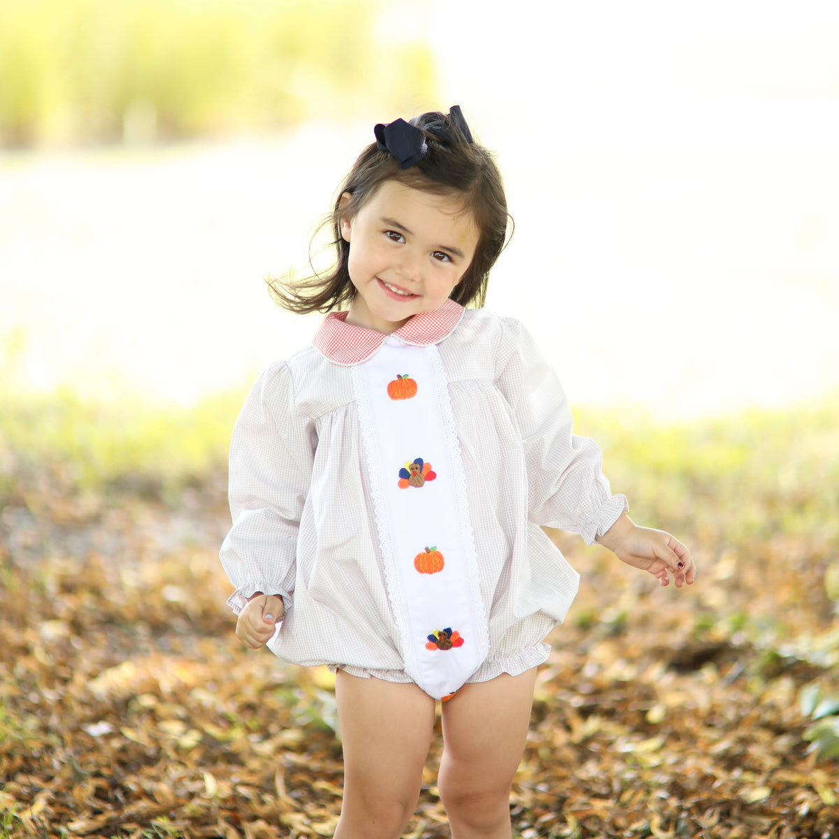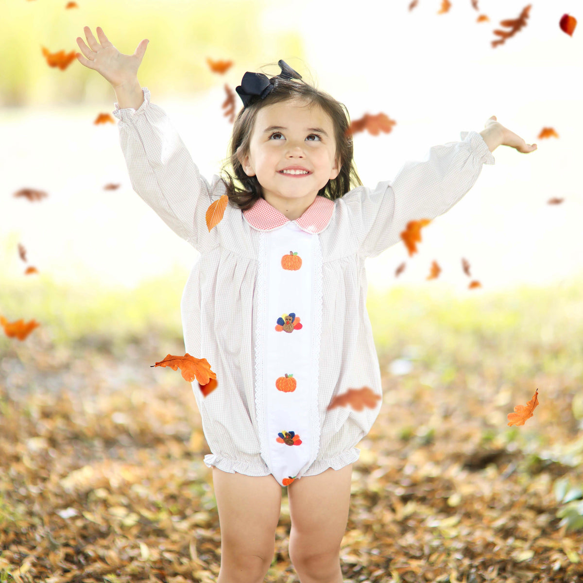 Celebrate the season in timeless style with our Thanksgiving Khaki Gingham Bubble! Featuring a classic khaki gingham pattern and sweet seasonal details, this cozy one-piece is perfect for Thanksgiving gatherings, family photos, and festive fall outings. Soft, breathable fabric and convenient snap closures make it as practical as it is adorable for your little one.