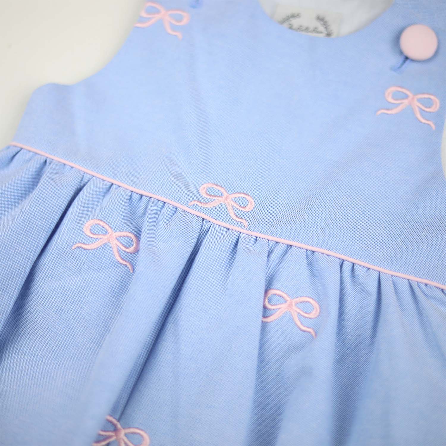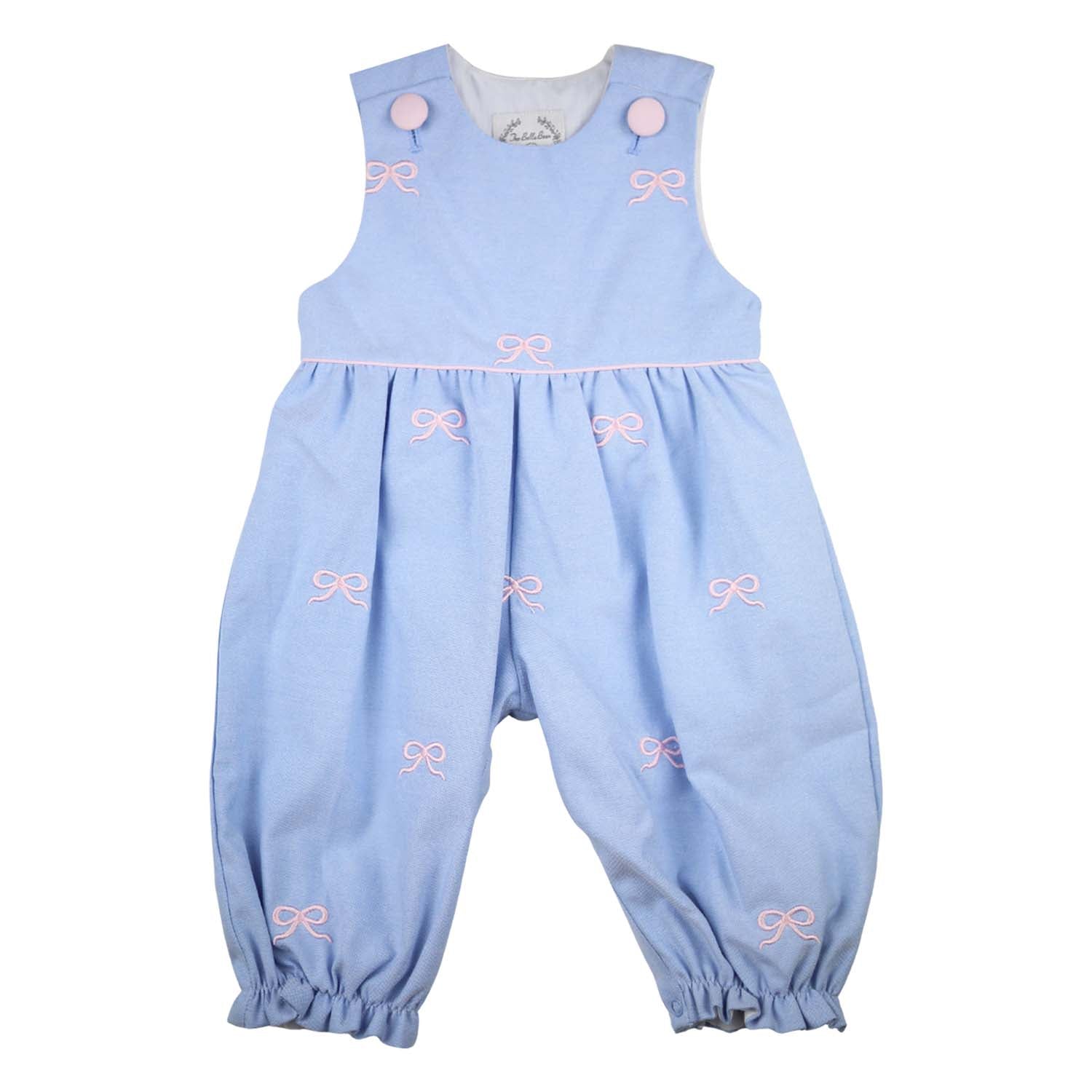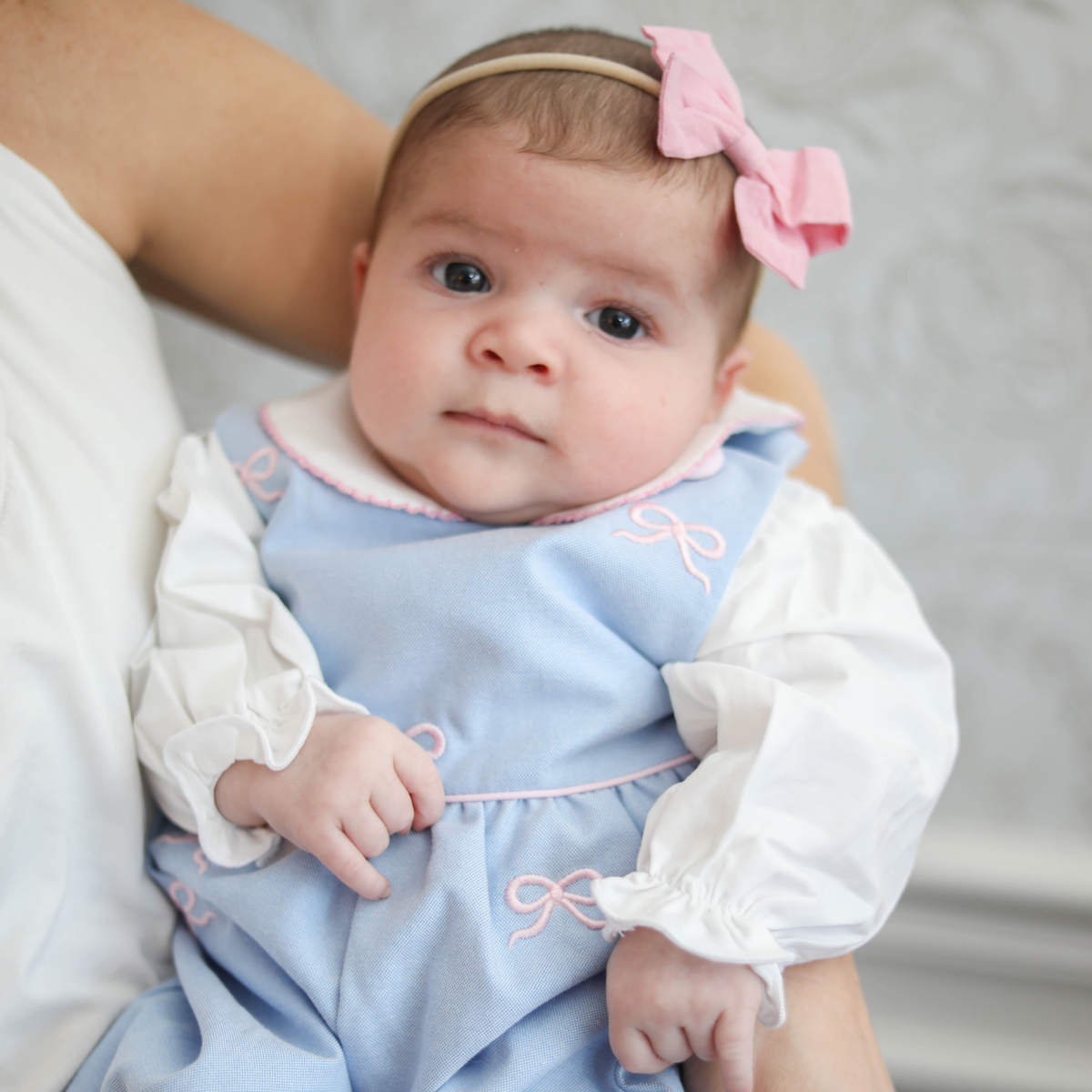 Sweet, polished, and perfect for any special occasion, our Baby Blue Oxford Embroidered Bow Romper is a timeless addition to your little one’s wardrobe. Crafted from crisp baby blue oxford fabric, this classic romper features delicate embroidered pink bow detailing for an extra touch of charm. Designed with comfort and convenience in mind, it includes easy snap closures for quick diaper changes and a soft, breathable feel for all-day wear. Perfect for birthdays, family photos, holidays, and celebrations, this precious girl’s romper is ideal for dressing up while keeping your little lady comfortable and cute. Perfect for gifting and sibling coordinating.