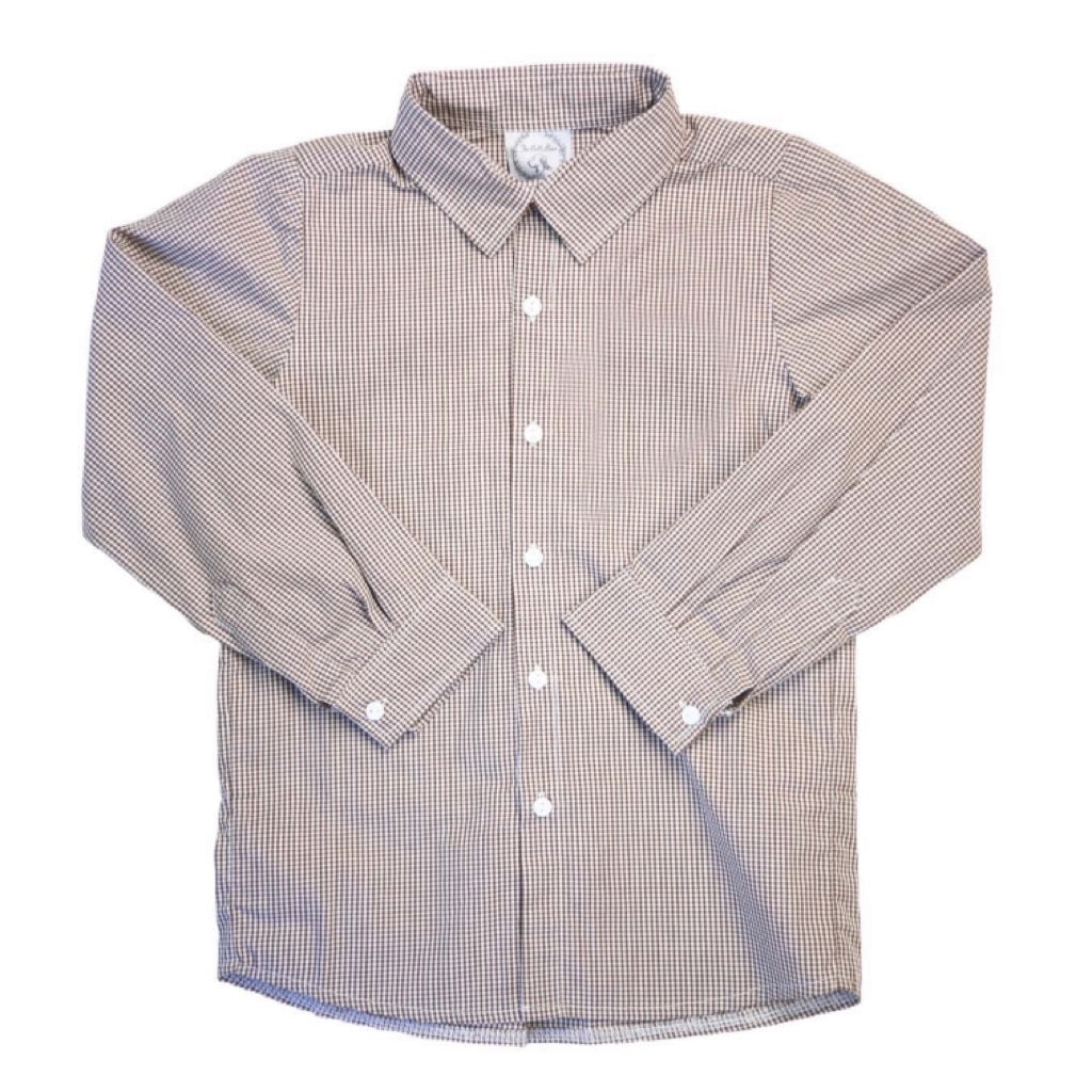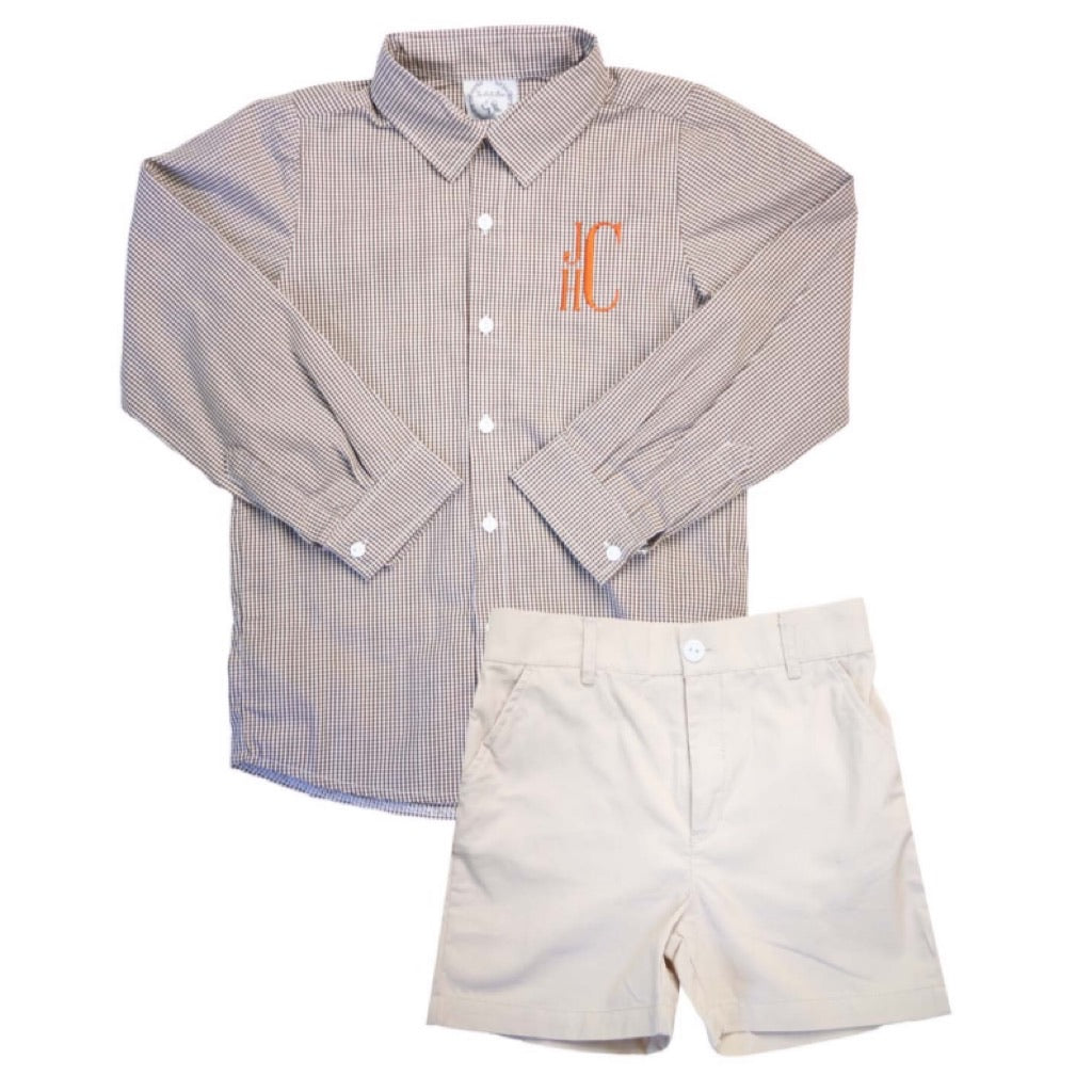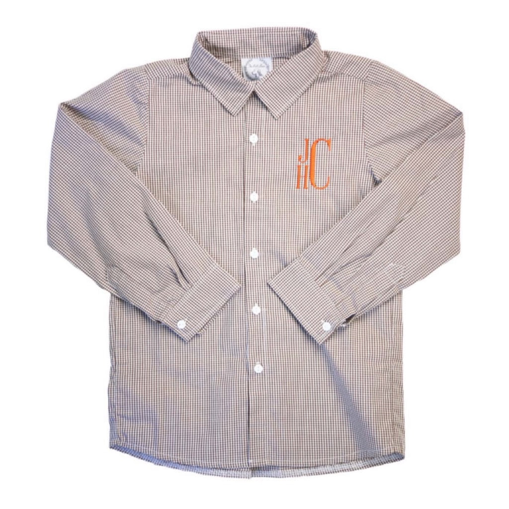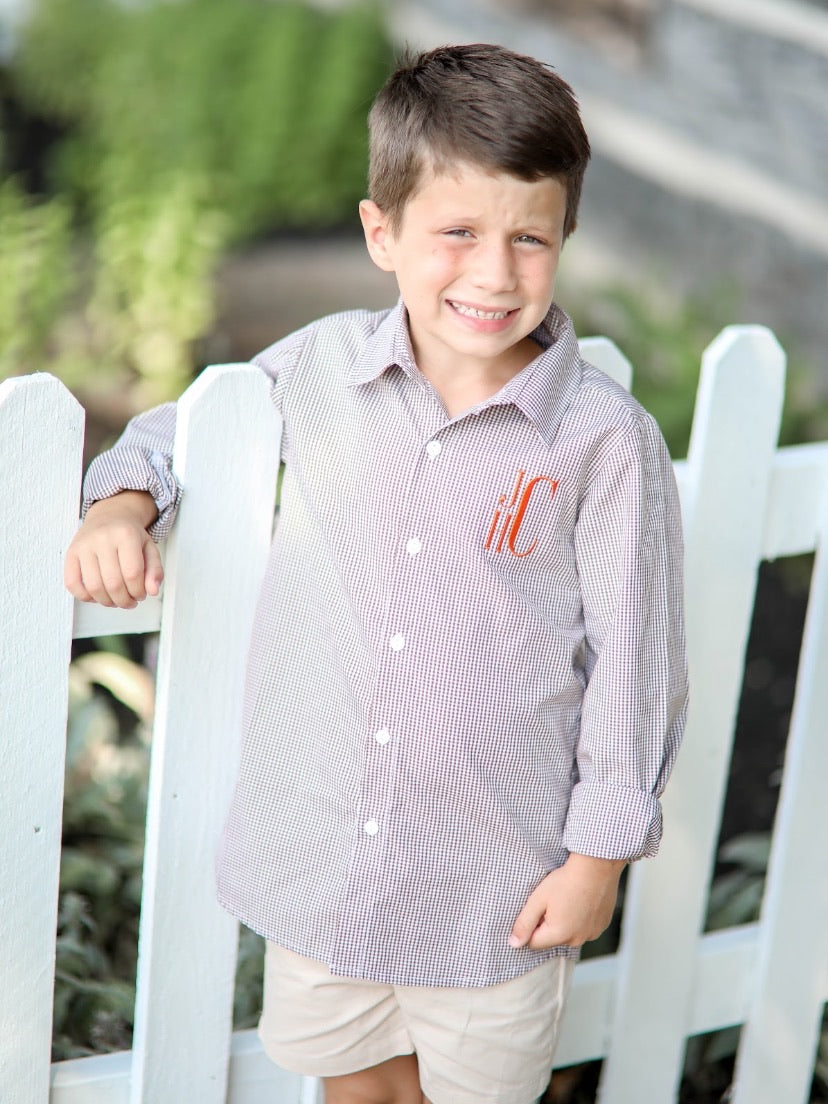 This button down shirt for your dapper young man is just perfect for this fall. Constructed of brown gingham fabric, nearly any color monogram looks perfect!
