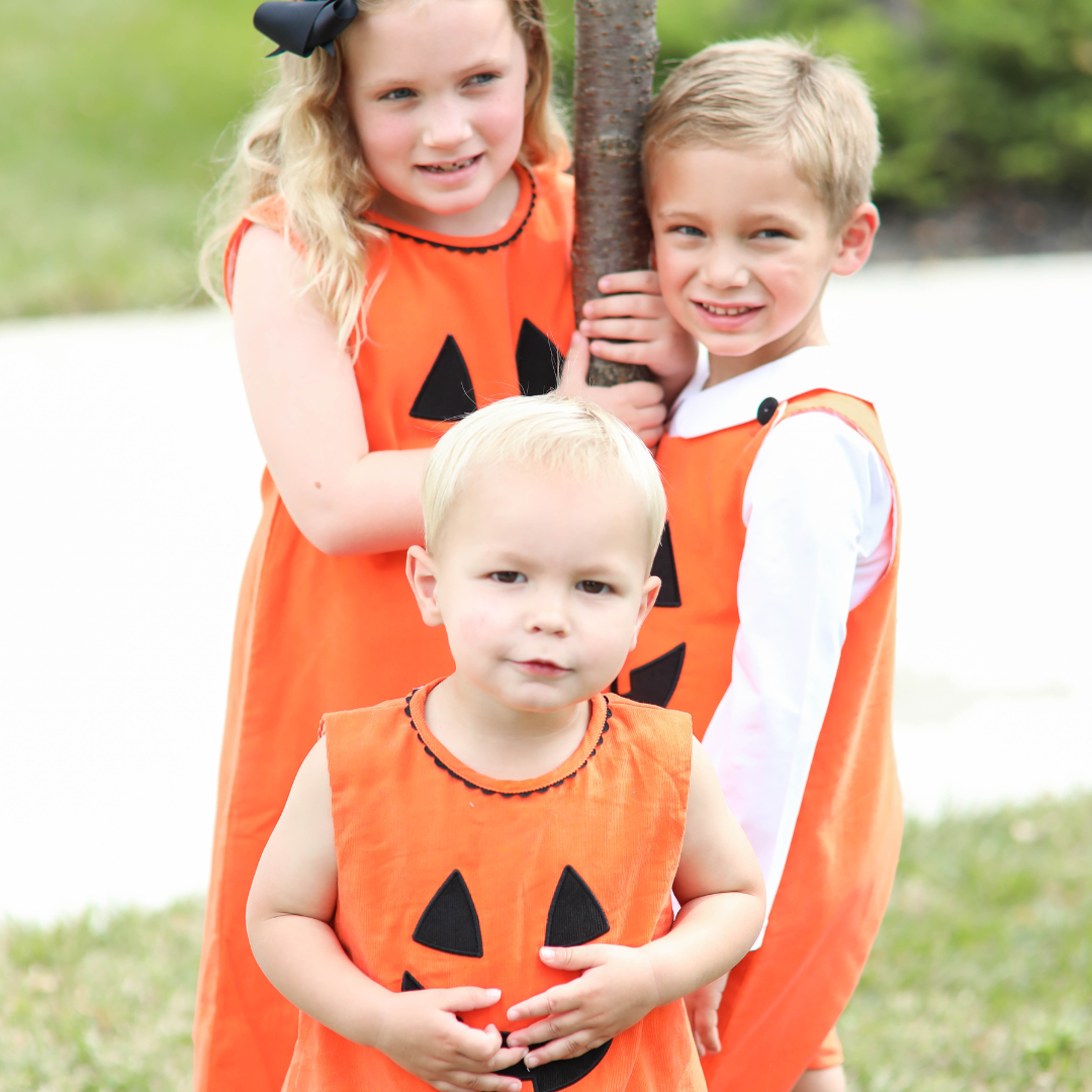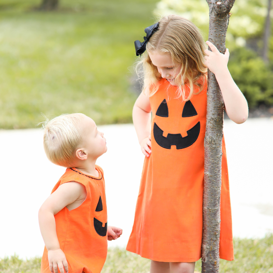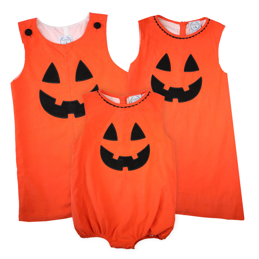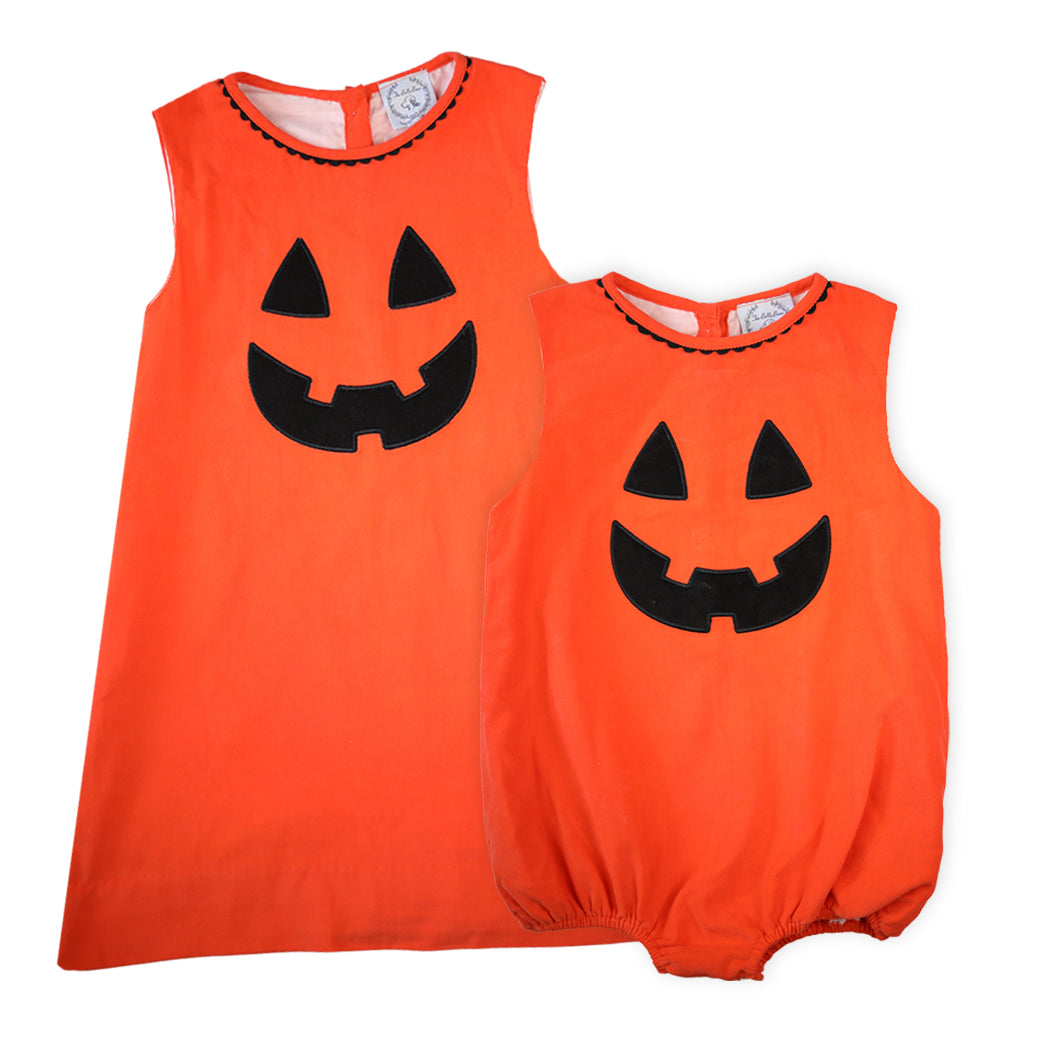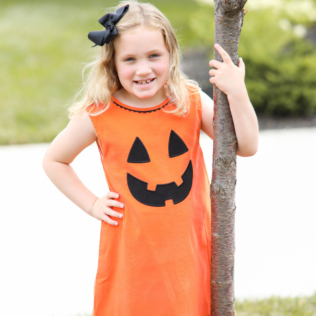 We’re giddy about this new design for Fall! It’s practically perfect for all of their pumpkin activities this spooky season! Made from bright and cheery orange corduroy, this dress features an appliquéd Jack-o-lantern face in black corduroy. Black Ric Rac lines the collar.