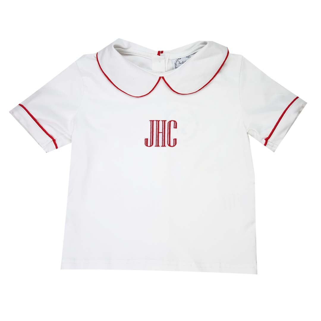 Red Pipe Trim Short Sleeve Peter Pan White Knit Shirt