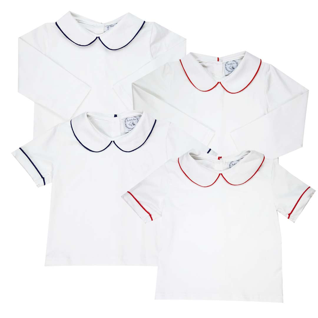 The Red Pipe Trim Short Sleeve Peter Pan White Knit Shirt is a timeless classic. Crafted from soft, breathable white knit fabric, this shirt features a traditional Peter Pan collar accented with bold red piping for a polished, standout look. Designed with short sleeves for warmer days and all-day comfort, it pairs beautifully with longalls, bubbles, and bloomers. Perfect for holidays, special occasions, or everyday classic dressing, this knit shirt is a versatile wardrobe staple.