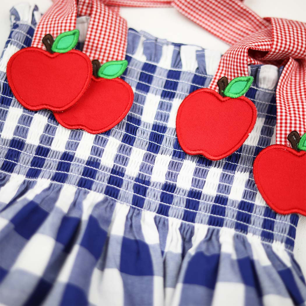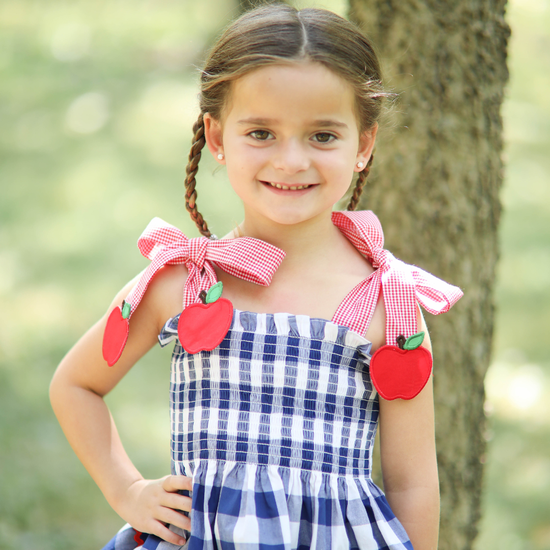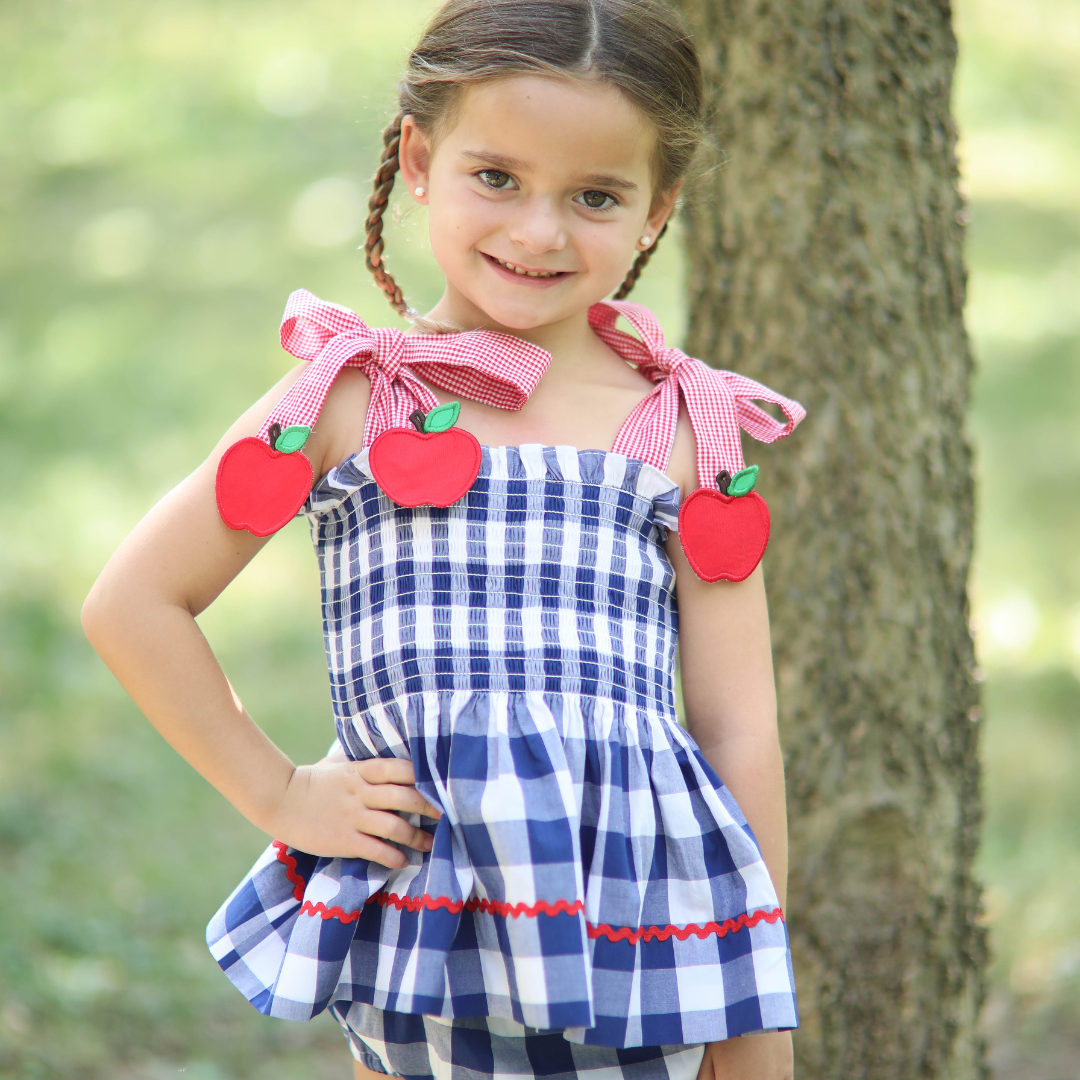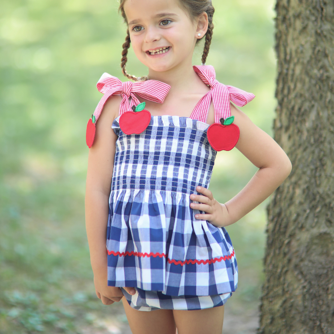 She’ll be perfectly dressed for the first day! And this one doesn’t disappoint for all of apple picking and Fall pictures. Made from classic navy blue gingham check cotton fabric, this stretchy smocked dress features appliquéd apples at the end of the red gingham check shoulder ties. Matching Red Ric Rac can be found at the hemline. The red check shoulder ties are adjustable and the dress length hits at the ankles. There is a matching sister bloomer set.