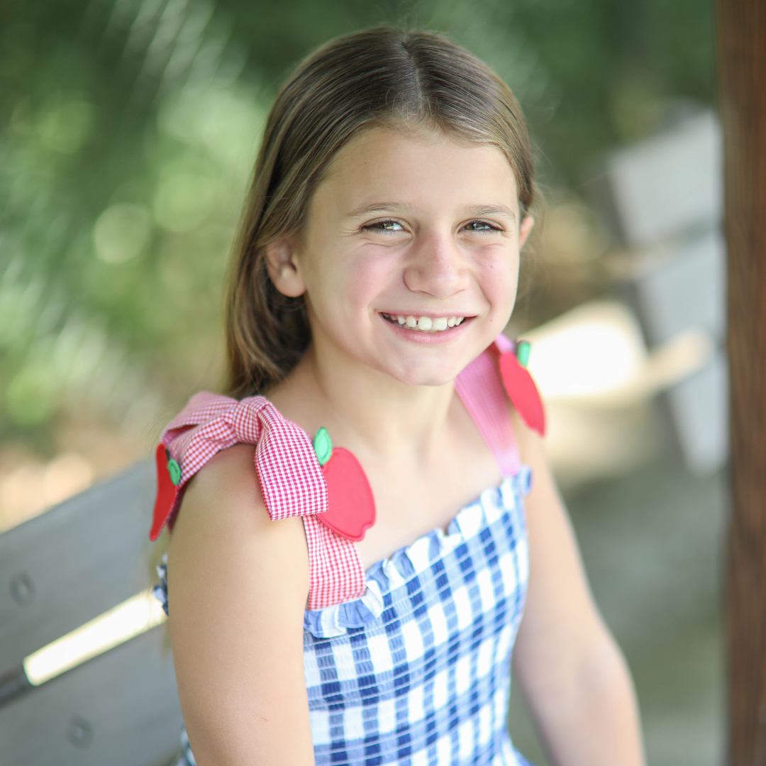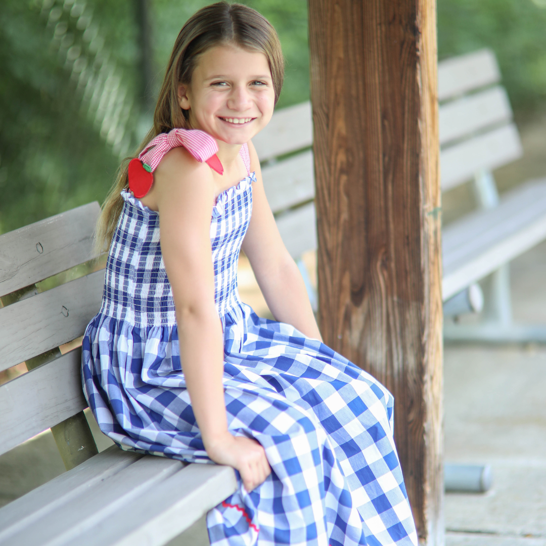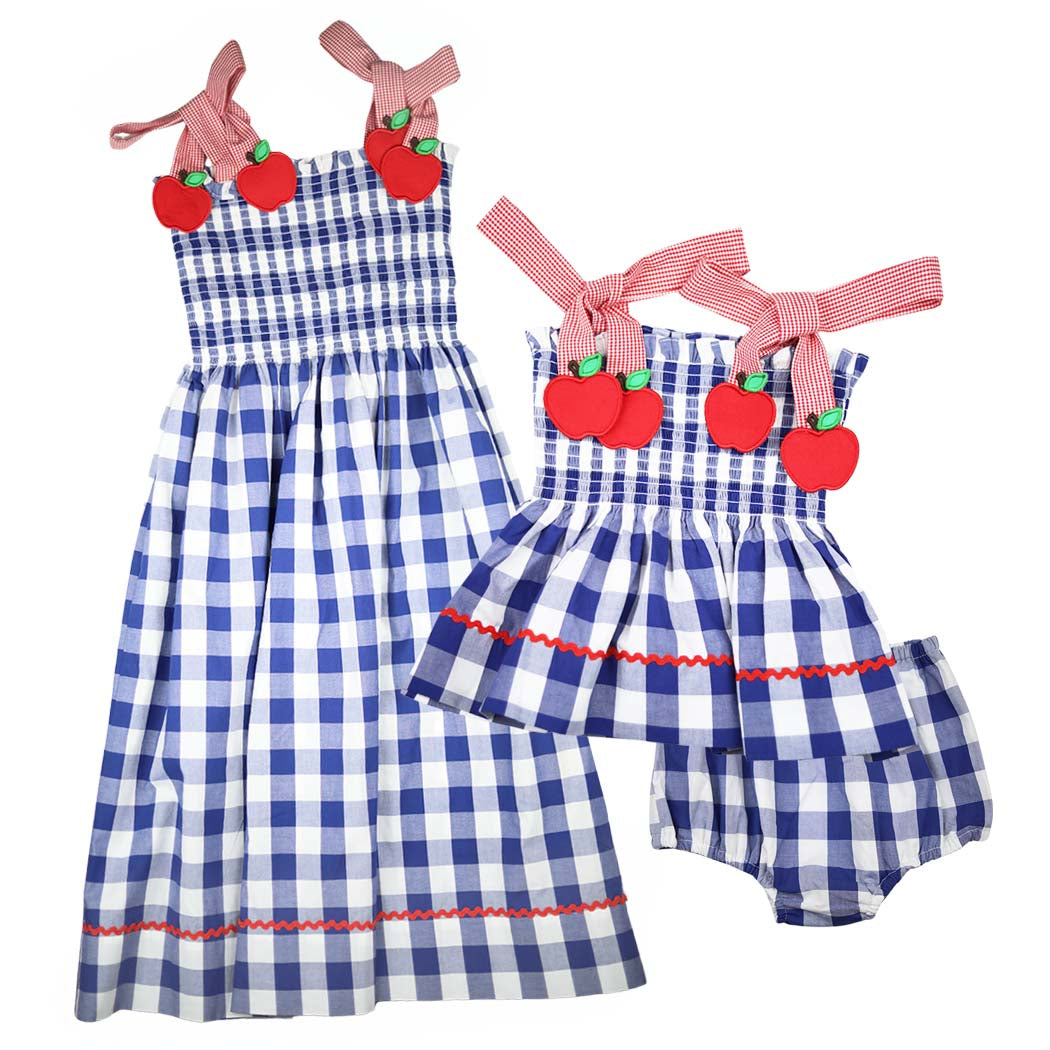 She’ll be perfectly dressed for the first day! And this one doesn’t disappoint for all of apple picking and Fall pictures. Made from classic navy blue gingham check cotton fabric, this stretchy smocked bloomer set features appliquéd apples at the end of the red gingham check shoulder ties. Matching Red Ric Rac can be found at the hemline and the set comes with matching bloomer bottoms. The red check shoulder ties are adjustable. There is a matching sister dress.